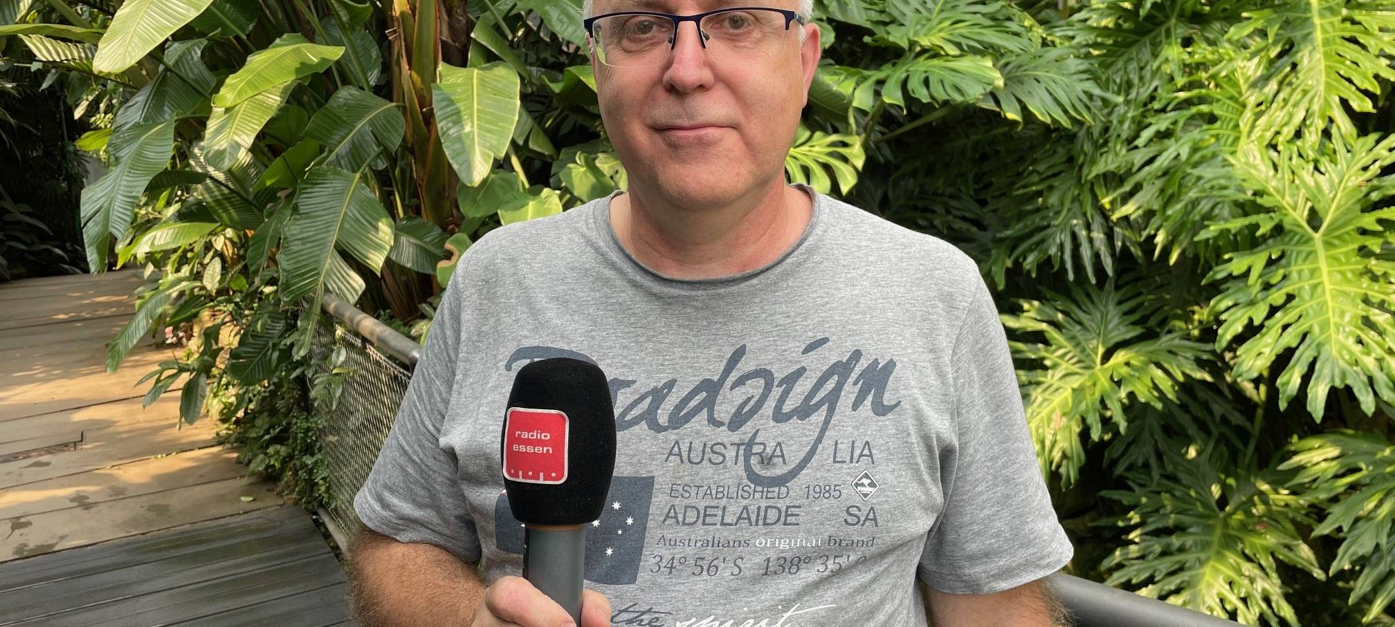 Was sonst noch an heißen Tagen hilft, erzählt er im Interview mit Radio Essen-Stadtreporter Timm Schröder. Zusammen gehen die beiden durch den Dschungel unter Glas im Grugapark. Hier gibt es viele Pflanzen zu entdecken und es kommen auch immer wieder neue dazu. Einige haben Früchte, die sogar essbar sind. Aber Vorsicht: Reife Kokosnüsse können auch einen bleibenden Eindruck hinterlassen, wenn sie von der riesigen Palme in der Mitte des Tropenhauses fallen. Da sind zum Beispiel die Mini-Bananen schon angenehmer. Dazu kommen seltene Gewürze und sogar Heilpflanzen. Thorsten Claas kennt sie alle und nimmt uns mit auf einen kleinen Rundgang durch das Tropenhaus.