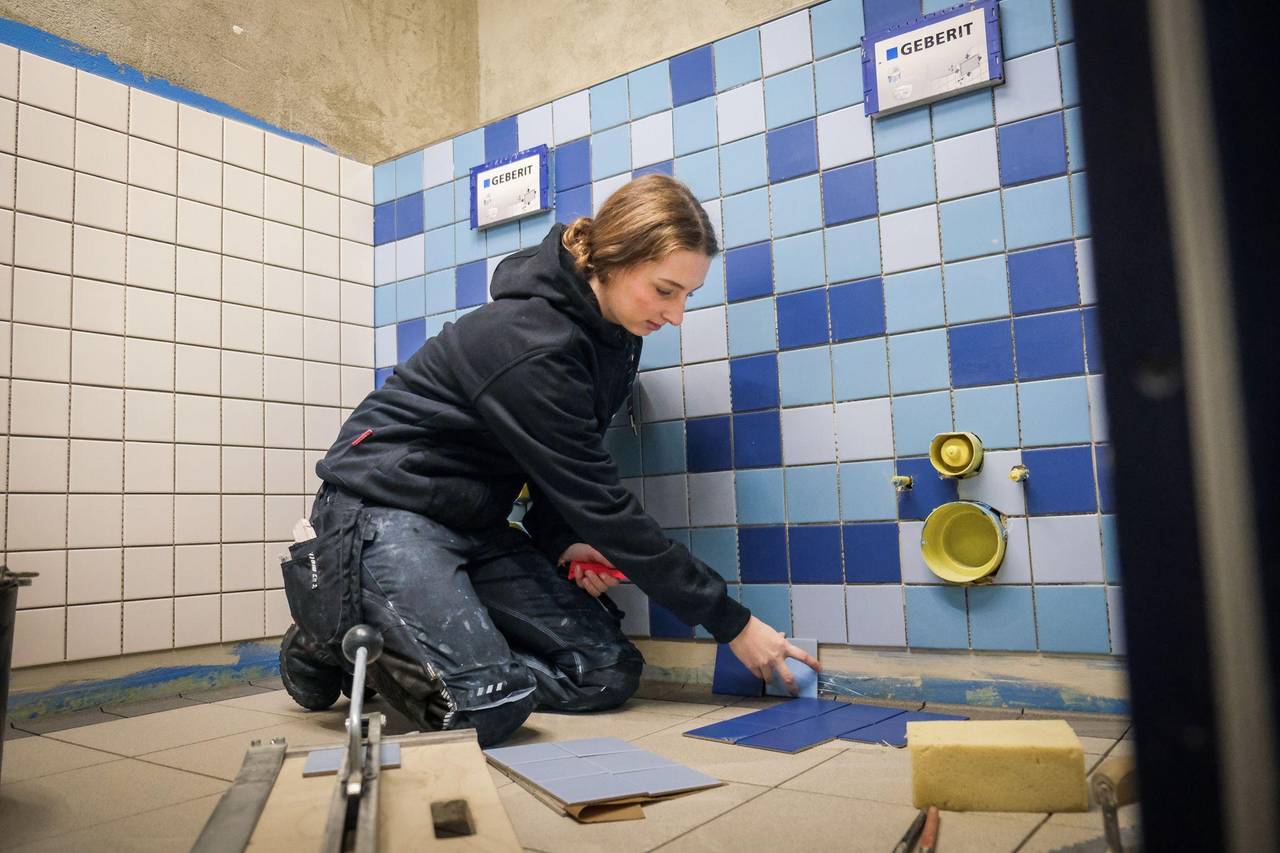 Herausfordernde und auch körperlich schwere Arbeit: Bereits in ihrem FHJ hat Celine Köster, Auszubildende zur Fliesen-, Platten und Mosaiklegerin, ihre Fähigkeiten unter Beweis stellen können. © Zacharie Scheurer/dpa-tmn