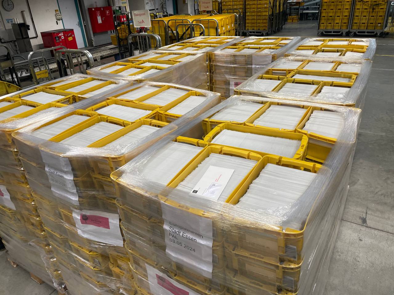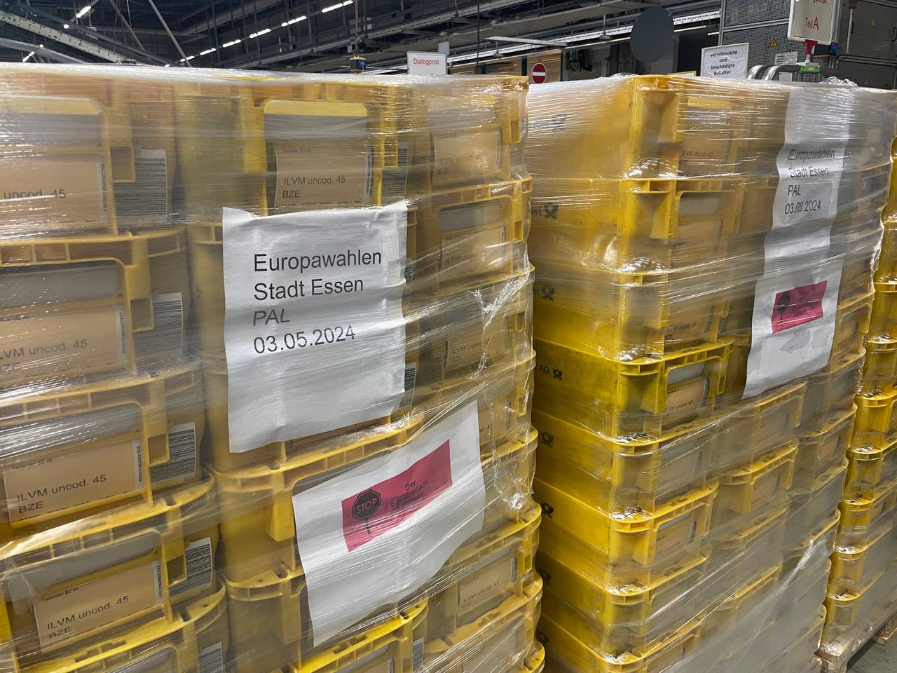 Die 450.000 Wahlbriefe wurden am Freitagmittag (03.05.) in Vogelheim angeliefert. Angekommen im Briefzentrum werden sie in mehreren Verfahren vorsortiert. Sie wurden bereits vor ihrer Ankunft im Briefzentrum adressiert und frankiert. In Millisekunden laufen die Briefe durch die Maschinen und landen in gelben Briefbehältern. Von da aus werden sie in LKW geladen und am Samstagmorgen (04.05.) in die sieben Zustellstützpunkte in Essen gebracht. Von dort aus tragen Postbotinnen und Postboten sie aus. Jeder von ihnen hat wegen der Europawahl über 1500 Briefe mehr auf seiner Route. Die Wahlbenachrichtigungen landen frühestens im Laufe des Samstags (04.05.) bei Euch im Briefkasten, in einigen Haushalten auch erst Anfang nächster Woche.