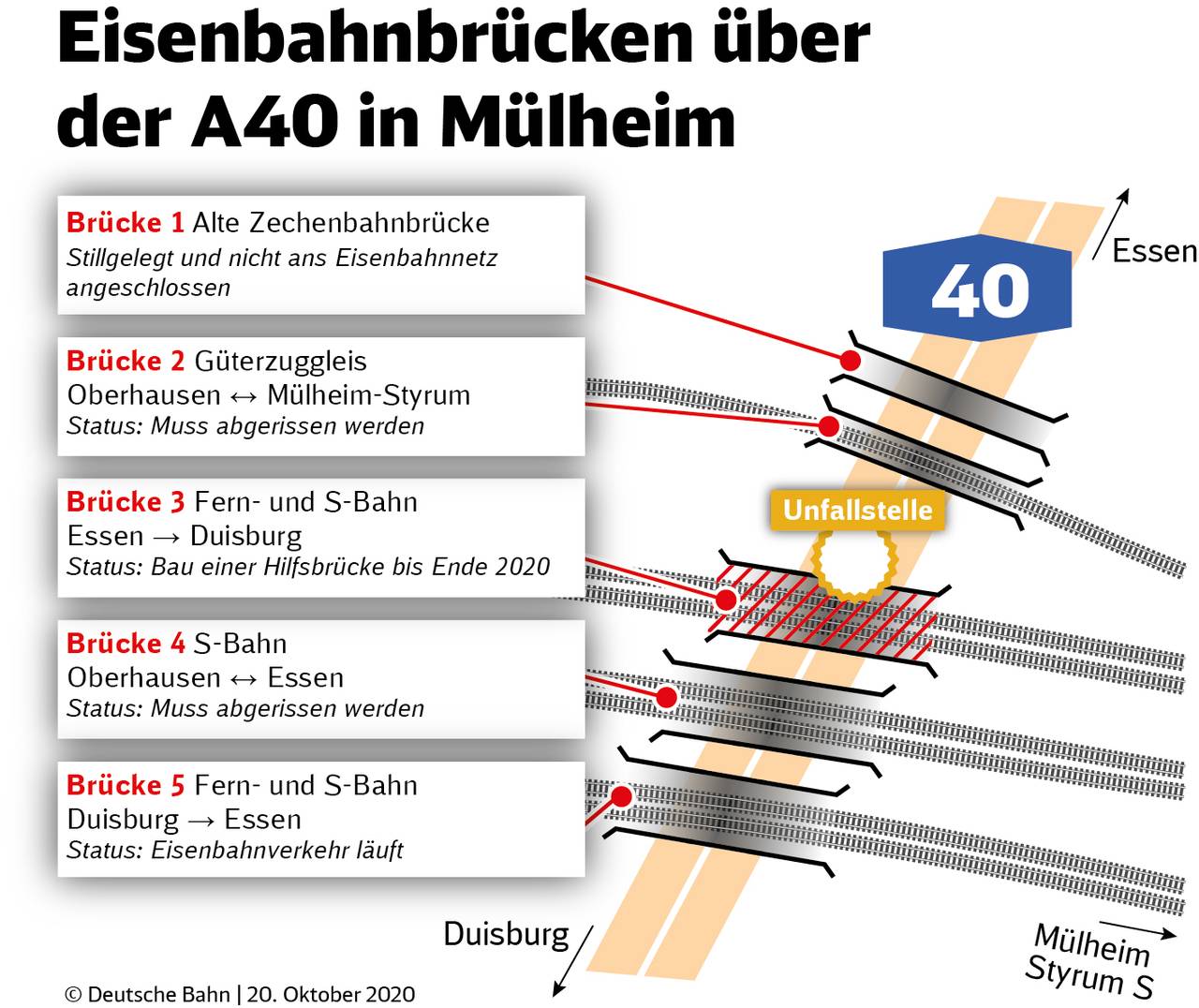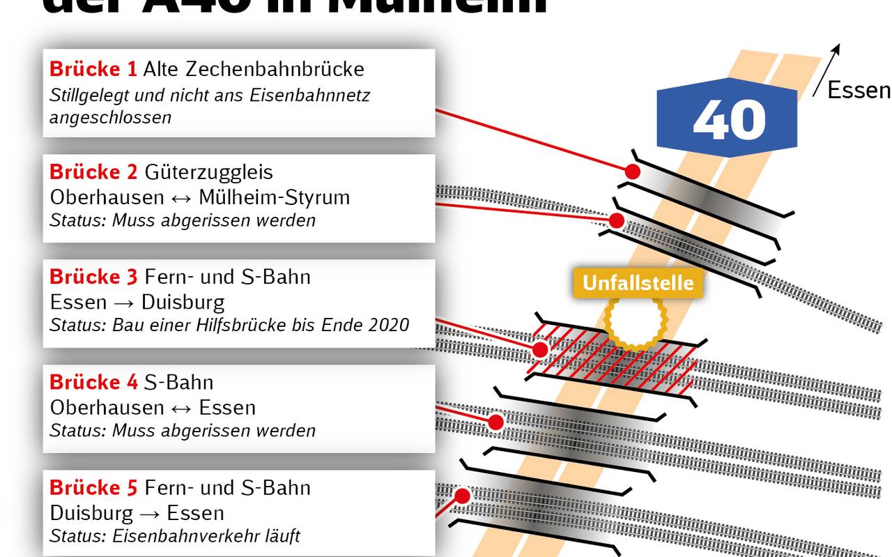 Nach dem Tanklasterunfall auf der A 40 bei Mülheim müssen zwei weitere Eisenbahnbrücken abgerissen werden. Dei Autobahn wird deshalb noch einmal komplett gesperrt. Auch für Bahnpendler gibt es keine guten Nachrichten.