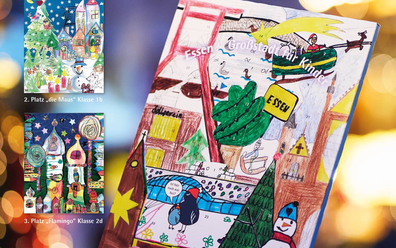 "Essen - deine Stadt, dein Lieblingsort an Weihnachten": Zu diesem Motto konnten die Schülerinnen und Schüler in den Grundschulen in der Stadt Bilder malen. Die Stadt hat drei der besten Bilder ausgesucht und damit den Adventskalender in diesem Jahr gestaltet. Das beste Bild kommt aus der Schule am Hellweg in Freisenbruch von den Schülerinnen und Schülern der Klasse M1. Auf Platz 2 und 3 landen die Schülerinnen und Schüler der Eichendorffschule in Schönebeck. Die Adventskalender sind mit Schokolade gefüllt. Die Pflegekinder in der Stadt bekommen alle so einen Adventskalender. Außerdem geht der Kalender noch an die Kinder in den städtischen Kinderheimen und an weitere Kinder und Jugendliche.