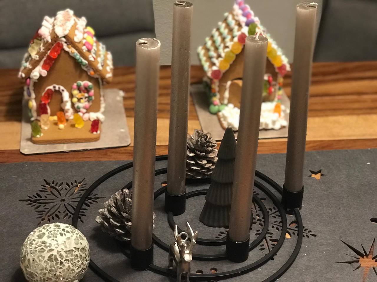 In eine Weihnachtslandschaft fügt sich der Adventskranz bei Radio Essen am Morgen-Moderatorin Angela Hecker ein. Wie Bäume recken sich die langen Kerzen in einer Landschaft aus Lebkuchenhäuschen und dezent platzierten Tannenzapfen auf dem weihnachtlichen Tischläufer.