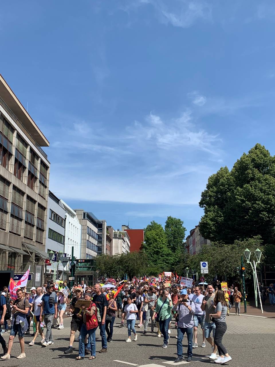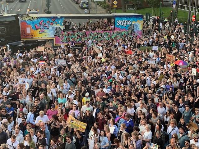 19:15 Uhr: Der Demo-Zug setzt sich langsam in Bewegung und zieht jetzt zur Helbingstraße und dann weiter auf die Kronprinzenstraße. Alle haben Spaß und feiern friedlich.