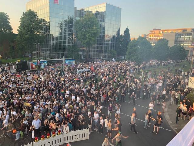 19:48 Uhr: Unser Radio Essen-Stadtreporter schätzt, dass inzwischen mehr als 1000 Menschen bei der Rave-Demo heute Abend dabei sind. Die Stimmung ist nach wie vor beschwingt. Viele tanzen zur Musik, unterhalten sich soweit das bei der Lautstärke möglich ist.