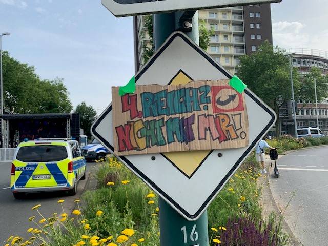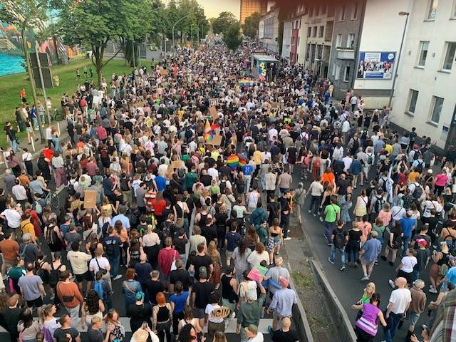 20:32 Uhr: Auf der Demo ist es sehr laut, der Bass gegen Hass wummert ganz ordentlich. Das scheint aber viele Menschen nicht zu stören. Weiter stehen viele an den Fenstern und in den sozialen Netzwerken steht "Essen du bist so wunderbar". Zwischendurch werden bei der Demo immer wieder Sprechchöre laut. Der Demo-Zug ist jetzt an der Haltestelle Cäcilienstraße und es geht direkt weiter auf die Klarastraße.