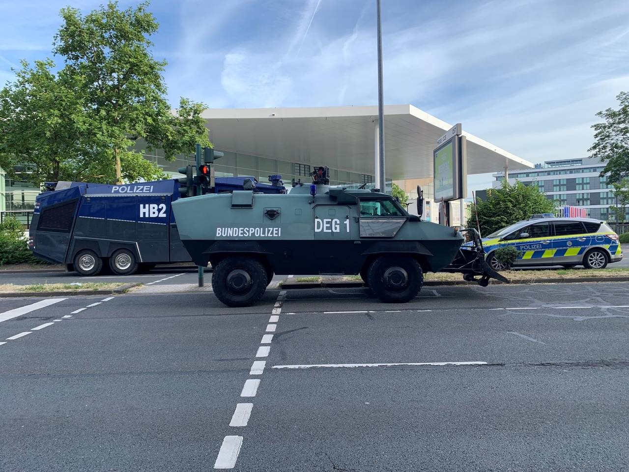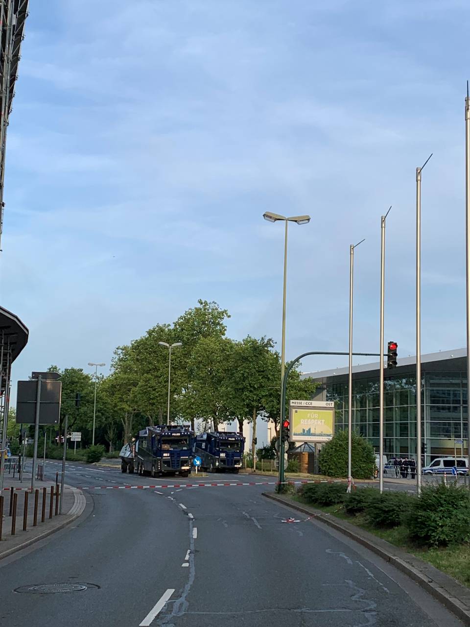 28.06.: Rund um die Messe sind immer mehr Polizistinnen und Polizisten im Einsatz. Teilweise kommen sie von außerhalb und müssen sich in dem Viertel erst einmal zurecht finden. Es wird auch immer wieder ein Polizeihubschrauber im Einsatz sein in den nächsten Tagen, erklärt die Polizei Essen. Vor der Grugahalle wurden inzwischen auch Wasserwerfer platziert. Die Fahrzeuge brauchen entsprechend Platz und wurden schon jetzt bereit gestellt.