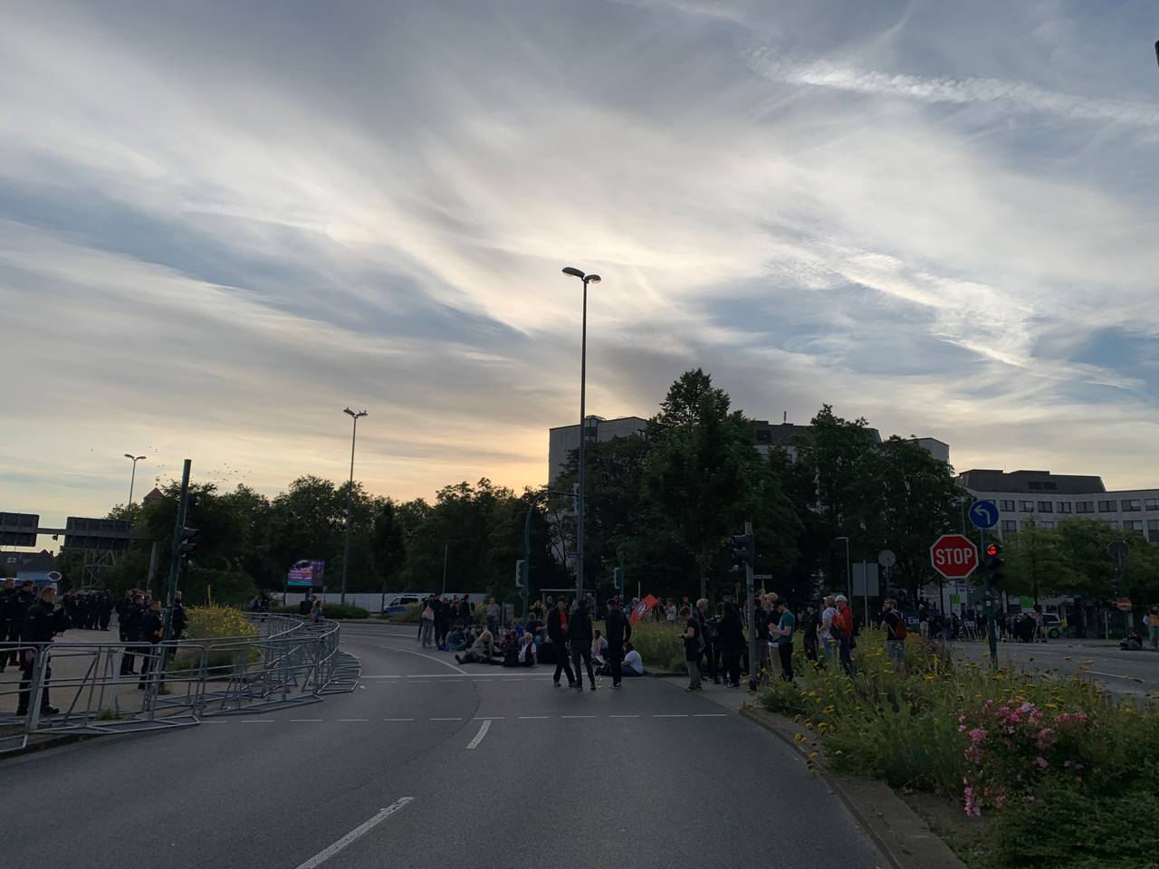 07:24 Uhr: Laut Verkündung der Demonstranten und Infos aus sozialen Netzwerken haben rund 300 Menschen alle Eingänge eines Hotels an der Hans-Böckler-Str. blockiert, in dem viele AfD-Delegierte übernachtet haben.