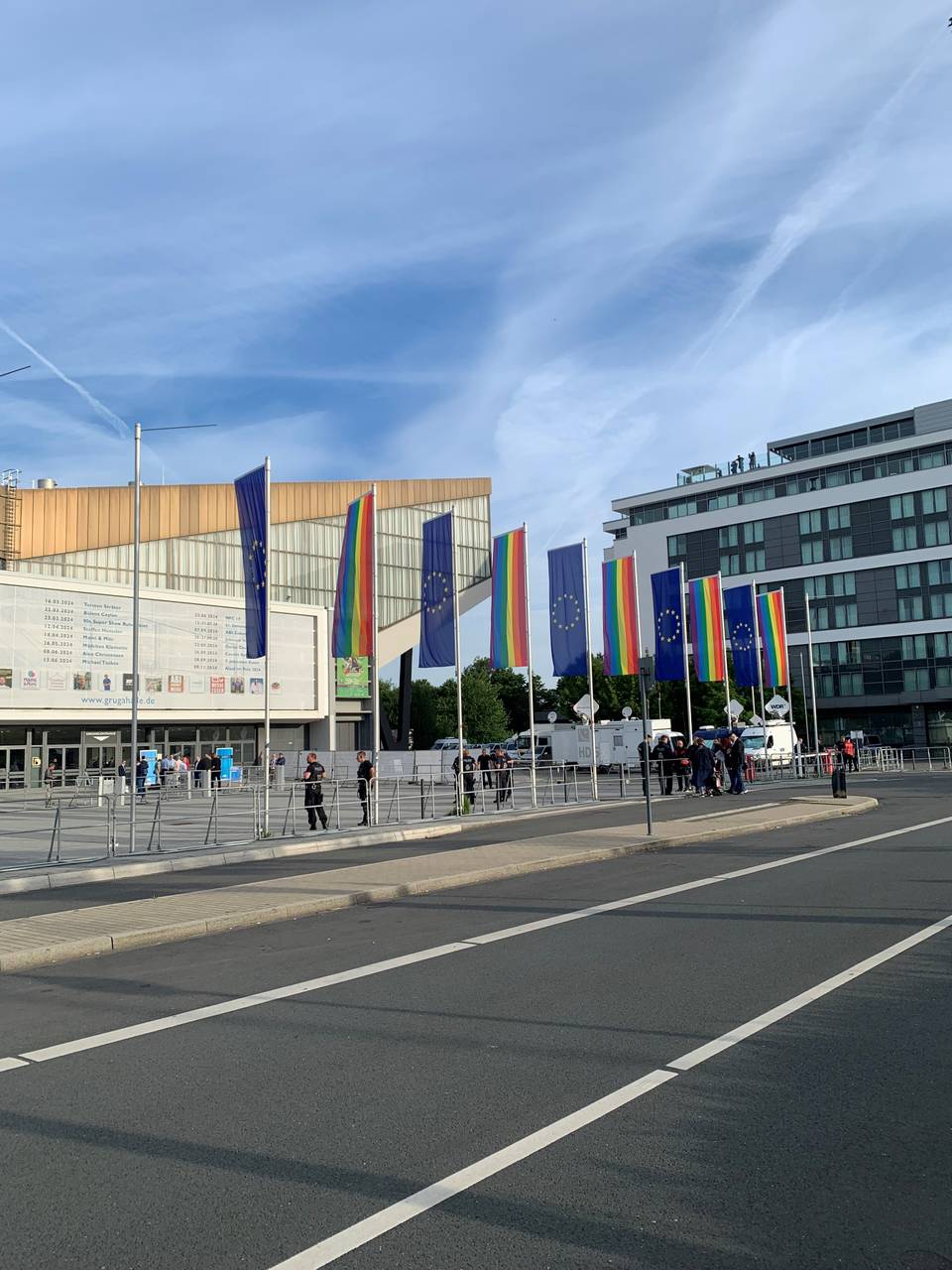 27.06.: Der Aufbau der Bühne auf dem Messeparkplatz P2 in Rüttenscheid lauft bereits. Inzwischen ist schon der dritte Tieflader mit Material angekommen. Das Team baut jetzt auch die Technik für die Bühne auf. Die Messe Essen hat vor der Grugahalle Europa- und Regenbogenfahnen gehisst, um ein Zeichen für Vielfalt und Toleranz zu setzen, erklärt eine Sprecherin auf Radio Essen-Nachfrage.