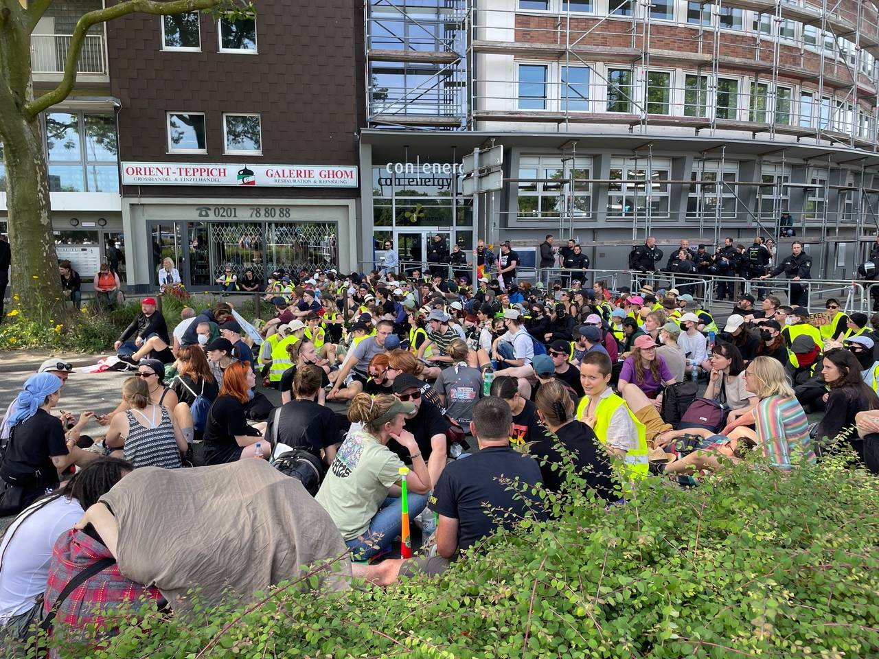 26.06.: Die Stadt Essen lässt an der Alfredstraße Höhe Norbertstraße auf der Mittelinsel die weißen Stangen abbauen. So sollen die Teilnehmerinnen und Teilnehmer an den Protesten auf der Alfredstraße ausreichend Platz haben und es gibt keine Hindernisse. Auf der Alfredstraße werden zusätzlich eine große Bühne und eine Leinwand aufgebaut. Dort wird am Samstag das Geschehen von der Bühne auf dem Messeparkplatz P2 übertragen. Dort wird es zahlreiche Reden geben und ein Musikprogramm.