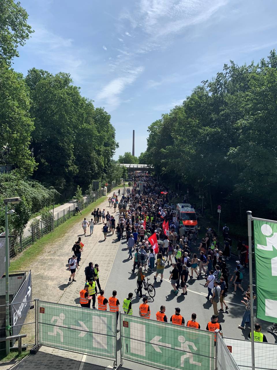 15:45 Uhr: Viele Demonstrantinnen und Demonstranten sind heute morgen mit Bussen aus ganz Deutschland angereist. Die Busse wurden am Berthold-Beitz-Boulevard abgestellt. Viele Menschen laufen jetzt schon wieder zurück über die Hans-Böckler-Straße und die Frohnhauser Straße und machen sich dann gleich wieder auf den weg nach Hause.