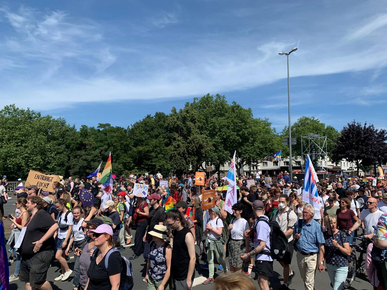 21:45 Uhr: Die Polizei zieht ein erstes kurzes Fazit der Demo und ist zufrieden. Bis jetzt gab es keine Zwischenfälle. Laut einer Sprecherin der Polizei sind 5000 Teilnehmerinnen und Teilnehmer bei der Versammlung dabei. Das sind fünf Mal mehr als die Veranstalter erwartet haben.