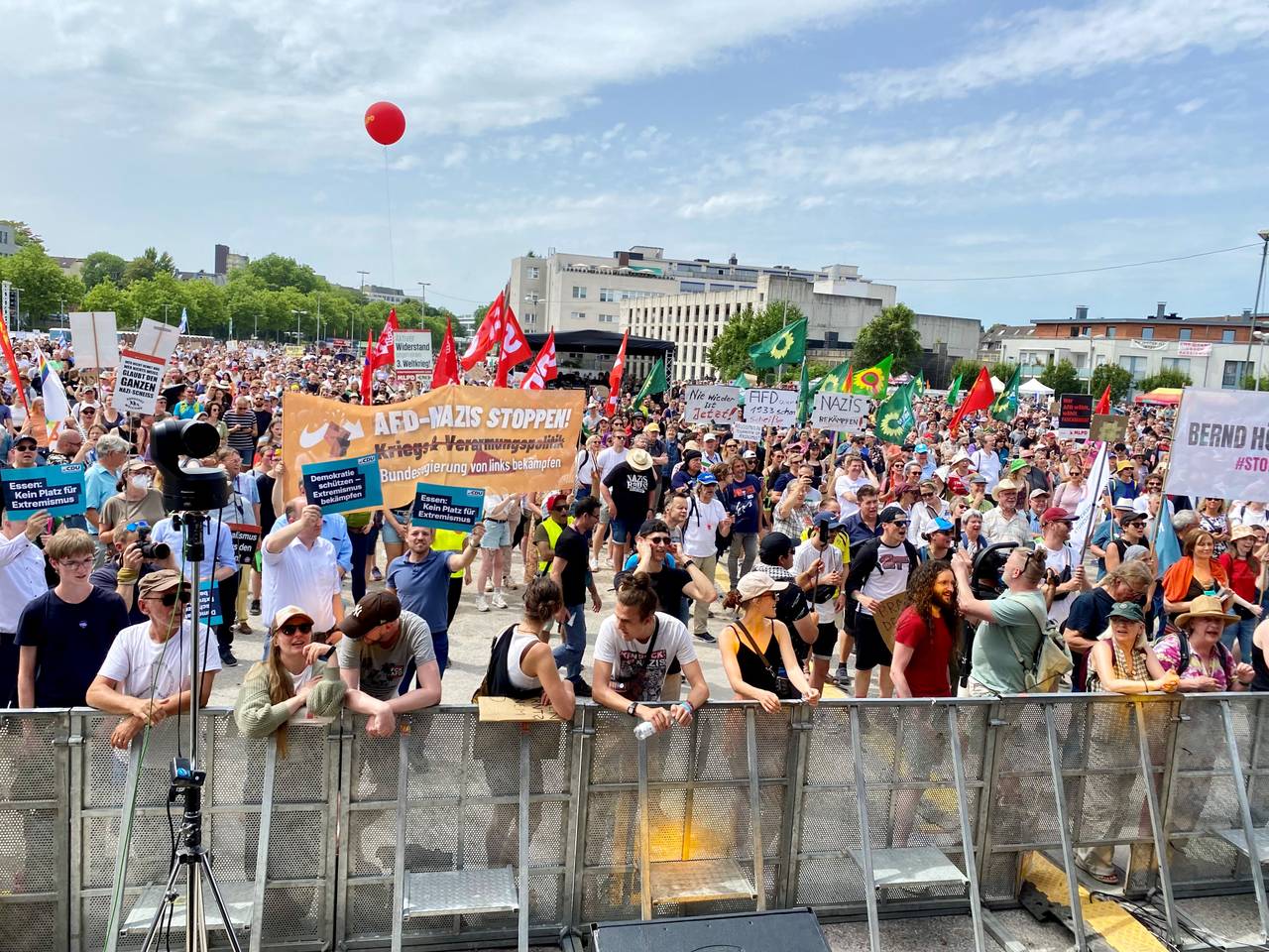 28.06., 18:30 Uhr: Ab sofort berichten wir live von den Protesten aus Essen. Die erste Demo soll um 19 Uhr am Hauptbahnhof starten. Das ist eine Rave-Demo unter dem Motto "Bass gegen Hass". Die Veranstalter erwarten rund 1000 Teilnehmerinnen und Teilnehmer. Die Demo endet vor der Grugahalle. Dort wird am Abend ein Empfang der AfD für Pressevertreter stattfinden. Der Zugang ist nur mit einer entsprechenden Akkreditierung möglich. Wir haben Radio Essen-Stadtreporter bei beiden Veranstaltungen und berichten.