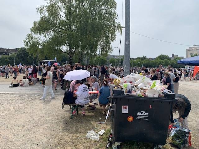28.06.: Im Hörsterfeld kommen immer mehr Menschen im Protestcamp an. Gegen Mittag waren bereits 350 Teilnehmerinnen und Teilnehmer dort. In einem großen roten Zirkuszelt haben sich alle versammelt und reden über die Politik der AfD und die Proteste am Wochenende. Dutzende große Zelte stehen auf dem Gelände und viele haben auch ihre kleinen Wurfzelte mitgebracht und schon aufgestellt. Die Organisatoren haben 100 Dixi-Klos aufstellen lassen, dazu mobile Waschbecken. Alle achten sehr auf die Mülltrennung. Viele sind um die 20 Jahre alt. Heute gibt es Pizza und Suppe zu essen und ein Truck hat noch einmal große Paletten mit Wasserflaschen angeliefert.