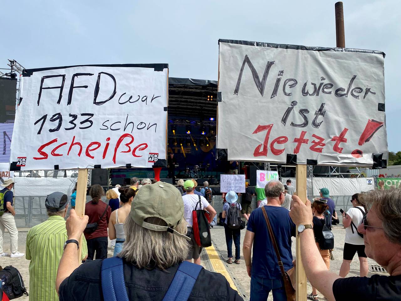13:00 Uhr: Die Fläche auf dem Messeparkplatz P2 füllt sich immer mehr. Die Stände haben inzwischen alle geöffnet. Es gibt was zu essen und vor allem zu trinken. Das Programm wird laut Aussagen eines Sprechers von "Aufstehen gegen Rassismus" wie geplant um 14 Uhr starten.