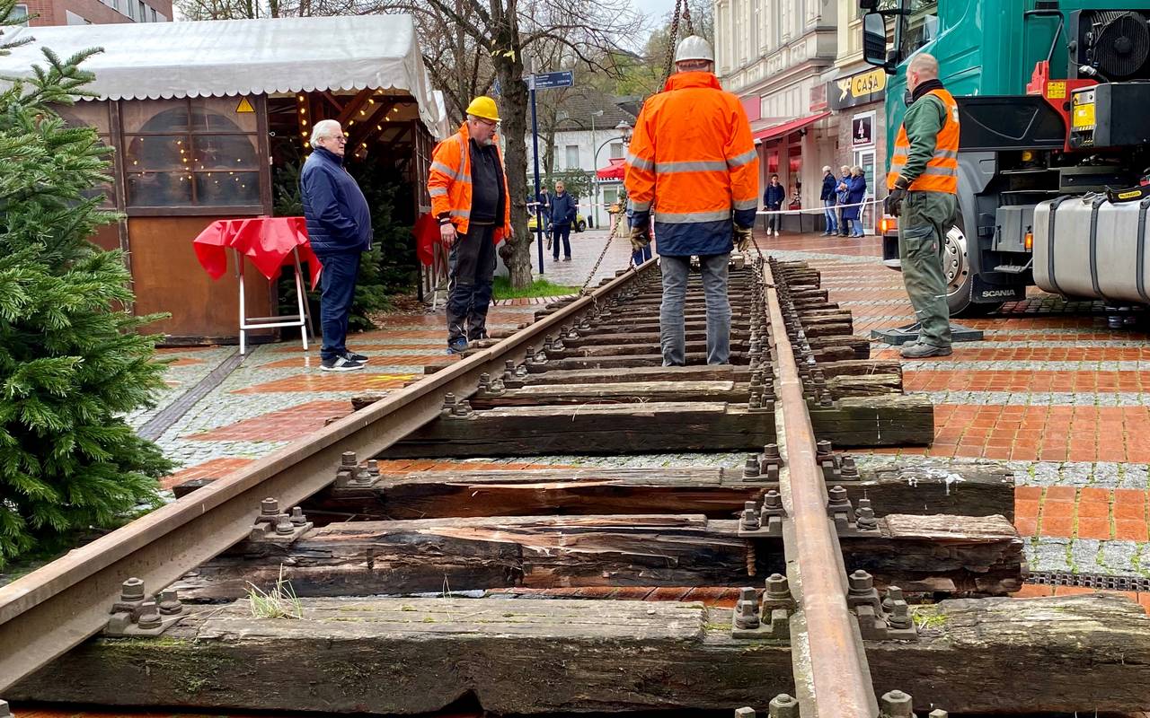 Ein Bahnverein aus Moers hat die Lokomotive dem Weihnachtsmarkt in Essen-Steele ausgeliehen. Eigentlich sollte sie schon letzte Woche zur Eröffnung des Weihnachtsmarkts kommen. Sie musste aber mit Tiefladern von Moers nach Steele gebracht werden. Für diesen Schwertransport brauchte es ein OK von jeder Stadt und das dauert. Heute steckte die Lok dann noch im Verkehr fest und kam erst mit zwei Stunden Verspätung an. Am 23. Dezember werden Lok und der Waggon wieder weggebracht.