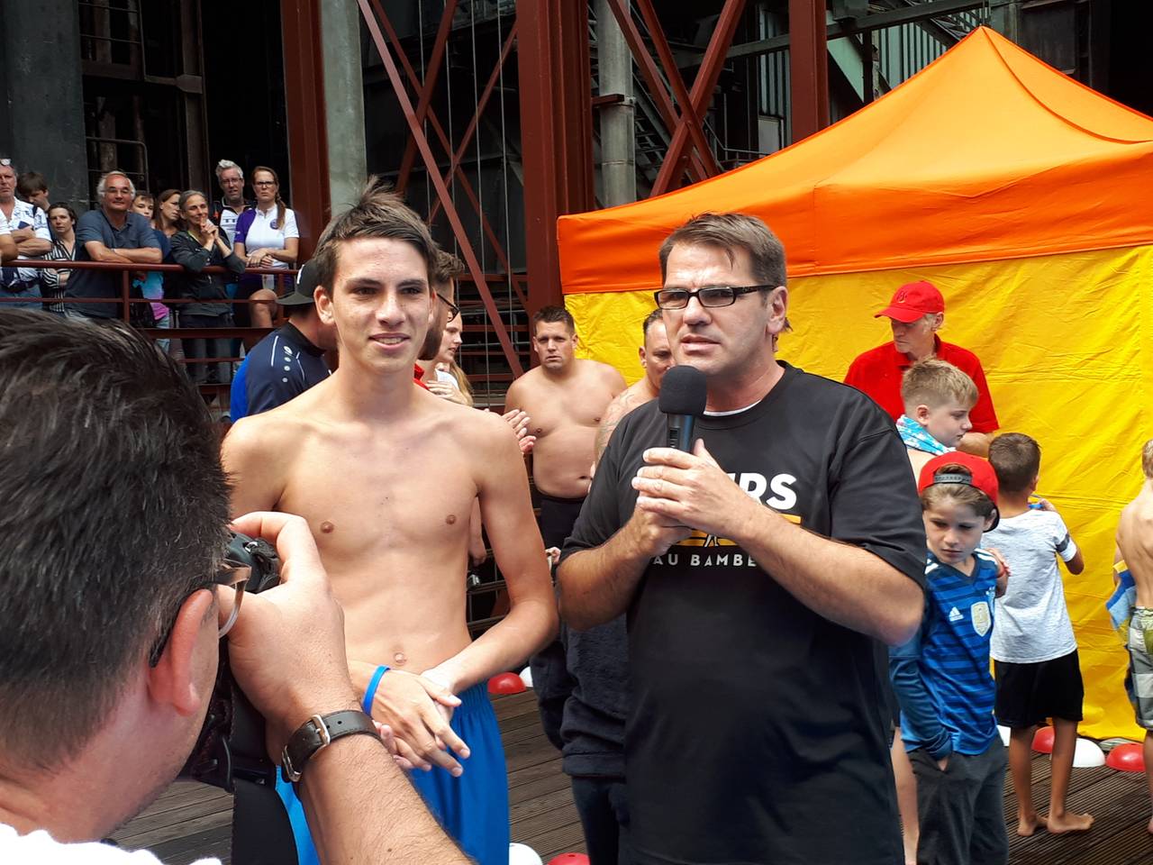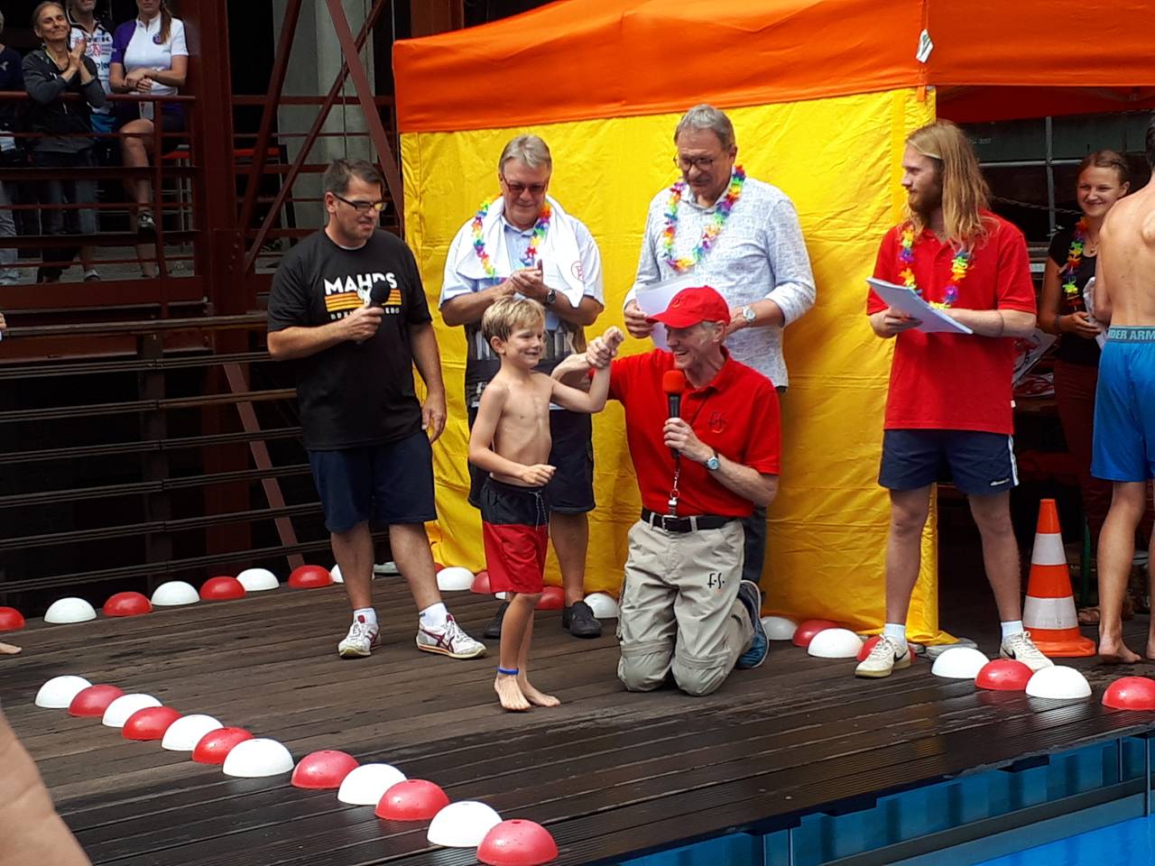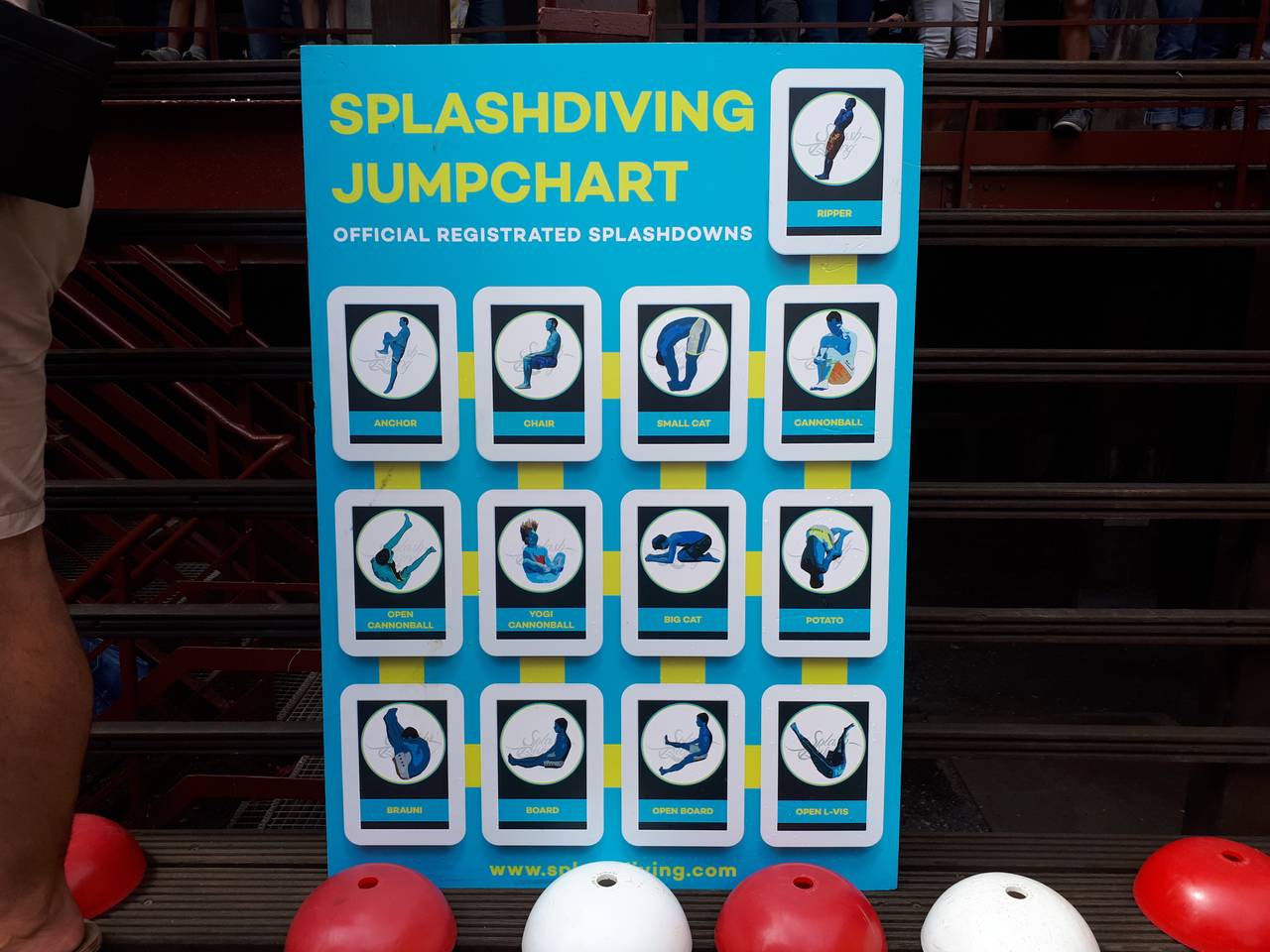 seit einigen Jahren ist die Arschbombe auch Nationalsportart, nennt sich dann "Splashdiving". Die Nationalmannschaft war auch am Start und zeigte, was sie kann. Mit dabei war auch die 16-jährige Lisa. Sie ist die jüngste im Team und amtierende Weltmeisterin. Mit dabei war auch der Trainer der deutschen Nationalmannschaft: er hat den Siegern ein Probespringen für die Nationalmannschaft versprochen. Damit die Zuschauer auch genau wissen, was für Arschbomben gezeigt wurden, brachte die Nationalmannschaft eine eigene Tafel mit.