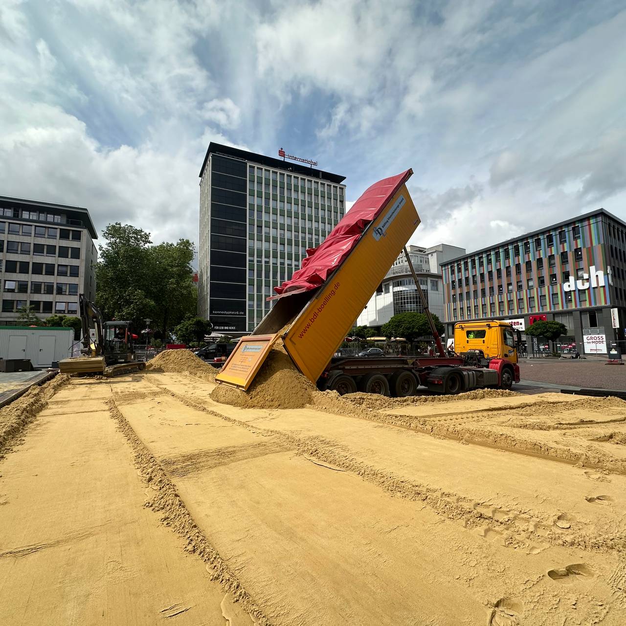 Am Freitag (17. Mai) konnte schon der Aufbau für das Sport-Event auf dem Kennedyplatz starten - nachdem alle Bühnen für das Stadtfest Essen Original abgebaut waren. Die Stadt Essen hat kurz darauf die große Tribüne auf dem Platz in der Innenstadt aufbauen lassen. Dann wurden 750 Tonnen Sand für die Beach-Volleyball-Felder angeliefert.