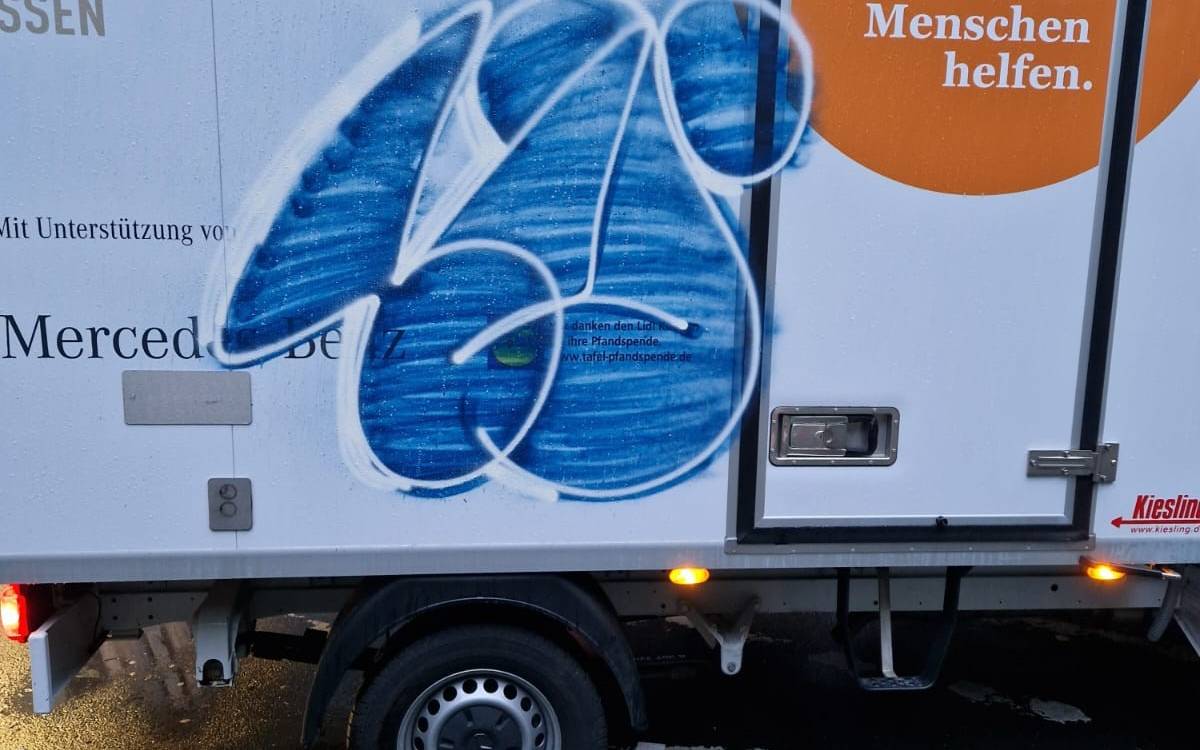 Blaue Graffitis wurden nachts auf zwei Lastwagen der Tafel in Essen gesprüht. Die Frühschicht sah die Schmierereien und reagierte sofort.