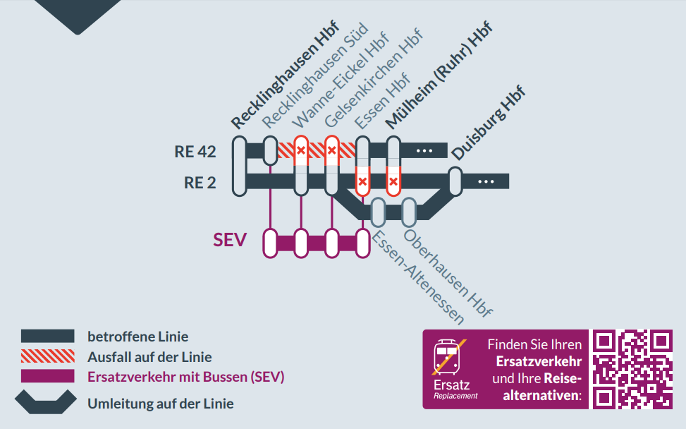 In Essen sind ab Freitag (1. September) die Auswirkungen einer Baustelle der Deutschen Bahn spürbar. Von Freitag, 1. September (21:15 Uhr) bis Freitag, 8. September (20.45 Uhr) und von Donnerstag, 21. September (5 Uhr) bis Freitag, 22. September (22.15 Uhr) werden am Bahnhof in Gelsenkirchen rund 3.900 Meter Gleise und drei Weichen erneuert. Hierbei werden 6.200 Schwellen und 13.000 Tonnen Schotter ausgetauscht. Aufgrund der Sperrung werden die Züge des RE 42 zwischen Recklinghausen-Süd und Essen Hbf in beiden Richtungen durch Busse ersetzt. Die Züge des RE 2 werden zwischen Gelsenkirchen Hbf und Duisburg Hbf umgeleitet und halten ersatzweise in Essen-Altenessen und Oberhausen Hbf.