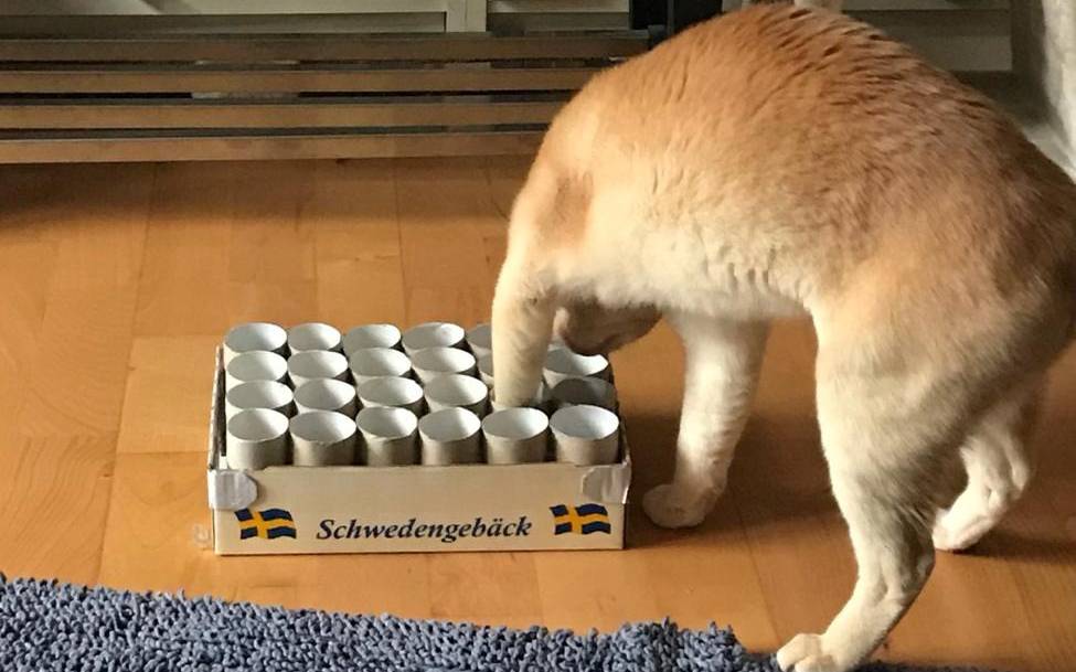 1) Schnappt Euch einen kleinen, flachen Karton oder einen Deckel und stellt leere Klopapierrollen so dicht nebeneinander, dass sie fest stehen können. Dann legt ein paar Leckerlis in einige der Rollen und der Spielspaß geht los.