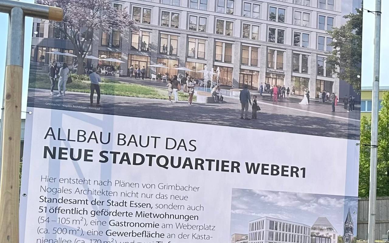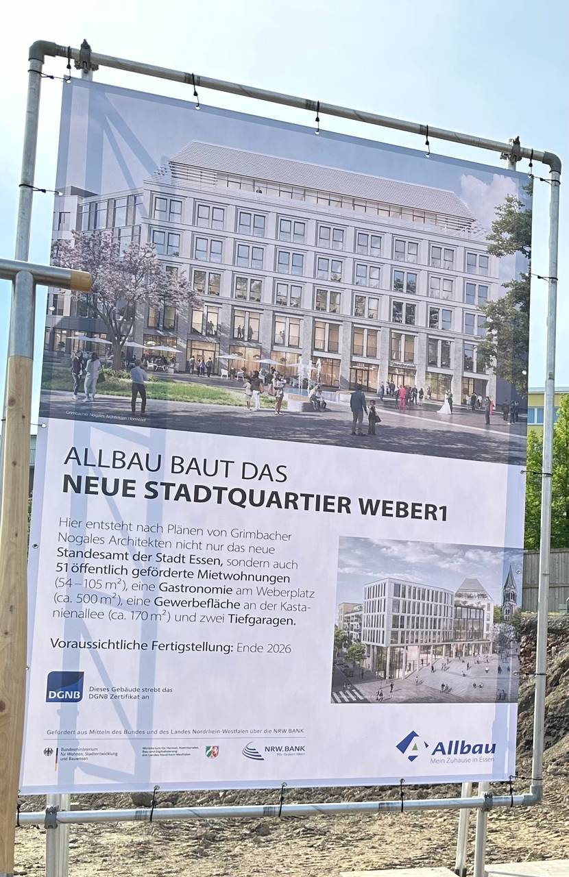 In Essen soll der Weberplatz bald ein neuer Anziehungspunkt in der nördlichen Innenstadt werden. Dafür wird der Platz komplett neu gestaltet. Die Architekten haben dazu ein grün-blaues Wohnzimmer entworfen. Eine große Freitreppe verbindet in Zukunft das neue Gebäude mit dem Platz in Richtung Uni-Viertel. Aktuell finden auf dem Platz noch archäologische Ausgrabungen statt. Früher war dort im Mittelalter ein Friedhof, der rund 200 Jahre genutzt wurde. Jetzt suchen und dokumentieren Archäologen die alten Grabstellen. Außerdem muss der Kampfmittelräumdienst den Platz noch untersuchen. Danach wird die Baugrube ausgehoben. Schon im Mai sollen die Politikerinnen und Politiker im Rat der Stadt den Bebauungsplan beschließen. Dann kann es mit dem Bau richtig losgehen. Aktuell rechnet die Allbau mit 53 Millionen Euro für den Neubau. Das Gebäude soll Ende 2027 fertig werden und ab 2028 wollen die Mitarbeiterinnen und Mitarbeiter des Standesamtes der Stadt Essen dort arbeiten und glückliche Paare trauen. Das wird dann auf jeden Fall an einem schöneren Ort sein als heute im Gildehofcenter.