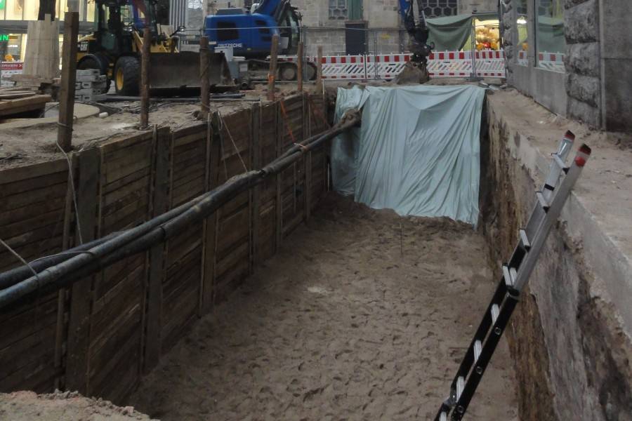 Am Kardinal-Hengsbach-Platz wird gerade gebaut, dabei ist man auf eine große Baugrube gestoßen. Da sich die Baugrube an einem publikumsintensiven Ort befindet, verrät die Stadt vorab schon einige Details: Es handelt sich dabei um eine mittelalterliche Mauer, Reste eines Pflasters aus Sandsteinplatten und zahlreichen Scherben von Tongefäßen aus dem 13. bis 16. Jahrhundert. Die archäologischen Arbeiten vor Ort sind zwar abgeschlossen, Stadtarchäologen versuchen aber im Moment genaueres herauszufinden. Im Boden unter der Innenstadt wurden schon öfter historische Spuren gefunden.