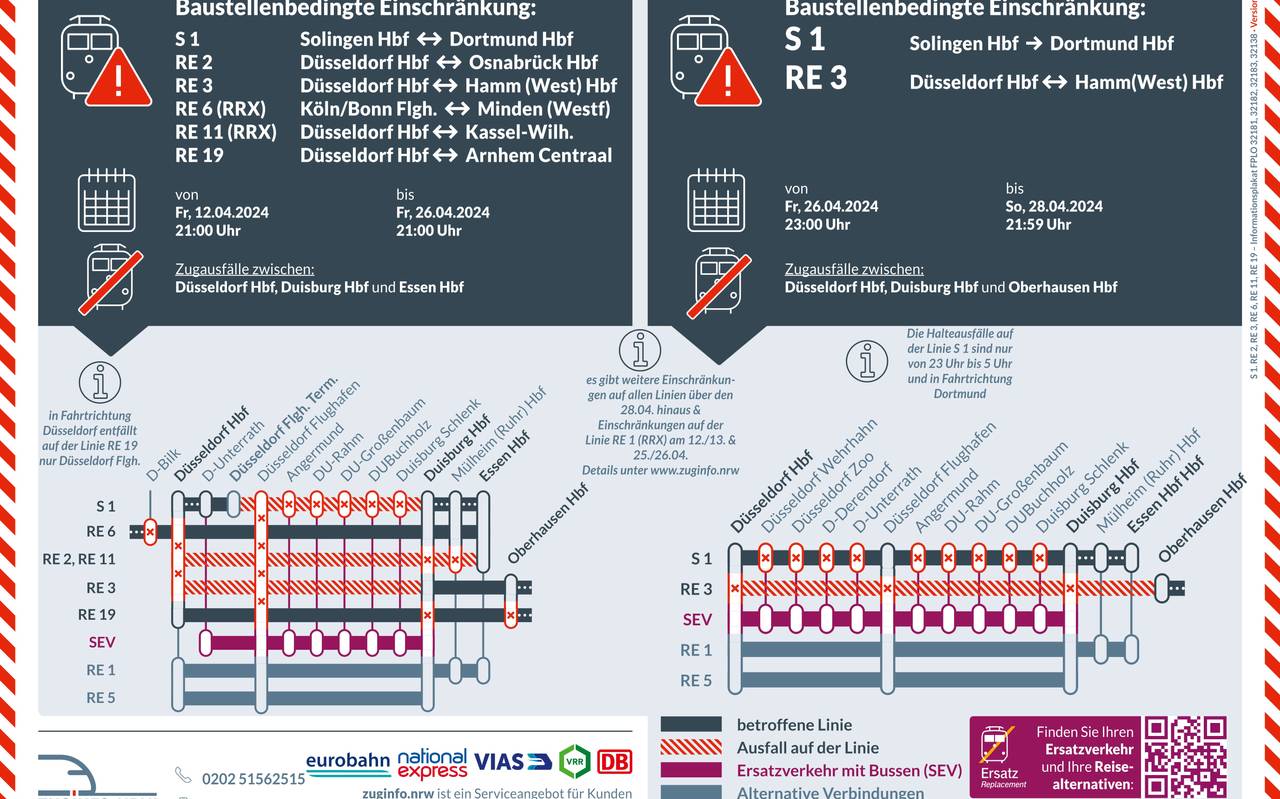 Pendler zwischen Essen und Düsseldorf brauchen erneut starke Nerven: Die Bahn erneuert ab Freitagabend (12. April) die Gleise zwischen Duisburg und Düsseldorf. Das sorgt auf vielen Linien für Einschränkungen. In Essen sind folgende Linien betroffen: