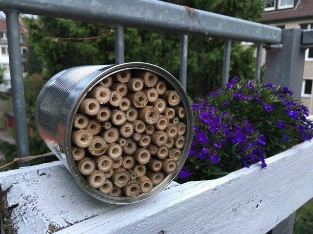 Jetzt könnt Ihr die Bambus-Stäbe in die Dose stecken. Damit alles auch hält und nichts wackelt, könnt Ihr Lockere stellen mit kleinen Ästen oder dünnen Bambusstäben "stopfen". Benutzt keinen Kleber! Durch das anfangs gebohrte Loch könnt Ihr eine Schnur ziehen und das Bienenhotel an einem trockenen Ort aufhängen. Im Umkreis von 300 Metern sollten auch Pflanzen für die Bienen wachsen. Das sind idealerweise Glockenblumen wie zum Beispiel Lobelien.