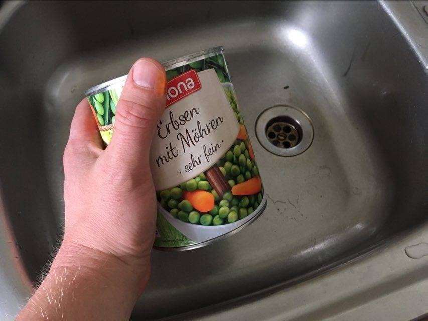 Zunächst müsst Ihr die Konservendose ausspülen. Achtet dabei darauf, dass es keine scharfen Kanten gibt, an denen Ihr oder die Bienen sich schneiden könnten. Wenn Ihr das Insektenhotel später aufhängen wollt, solltet Ihr schon jetzt ein Loch in der Nähe vom Rand in den Dosenboden Bohren.