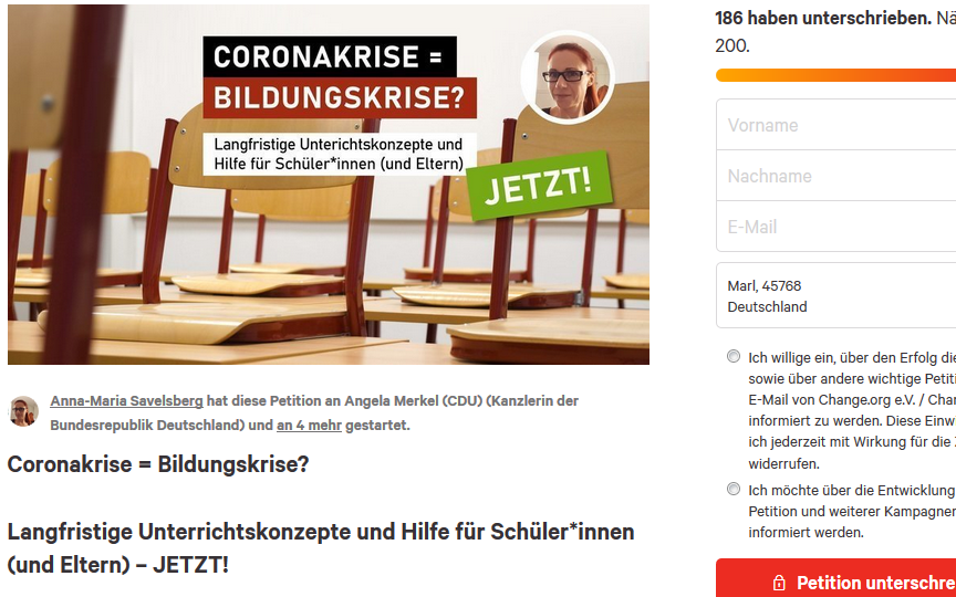 Die zentralen Forderungen in der Petition: Die Digitalisierung müsse vorankommen, Kinder ohne entsprechende Technik zu Hause müssten besser unterstützt werden, die Zahl der Schüler pro Klasse sei zu hoch, Toiletten und Waschräume müssten an neue Hygiene-Standards angepasst werden. Man müsse jetzt die Zeit nach den Sommerferien planen und nicht erst, wenn das neue Schuljahr beginnt.