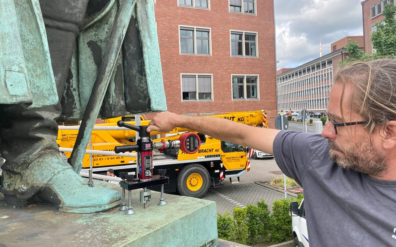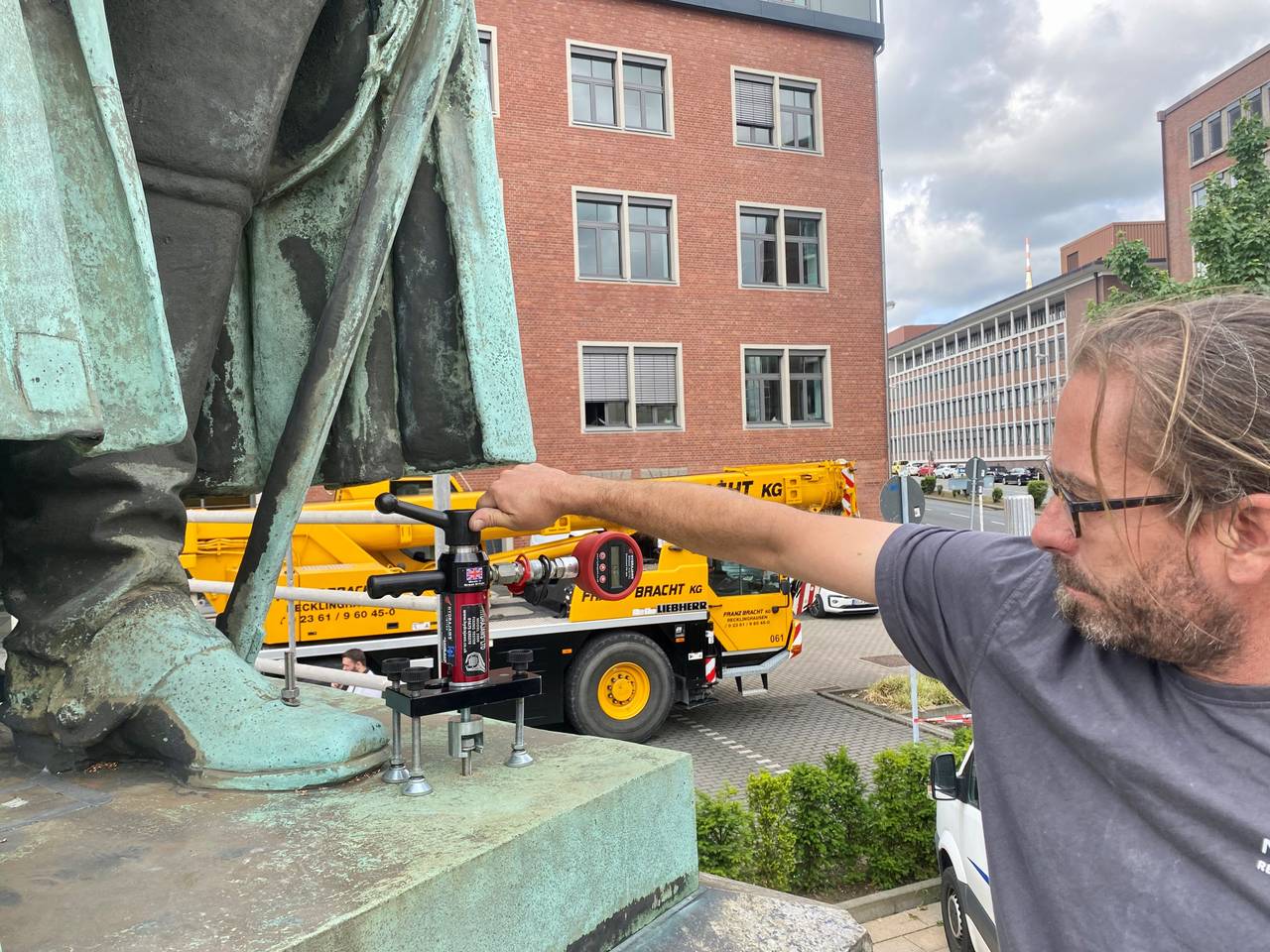 Die Bismarck-Statue in Essen kehrt nach anderthalb Jahren wieder an ihren Platz zurück. Mit neuen Schrauben soll die Statue jetzt für immer sicher stehen.