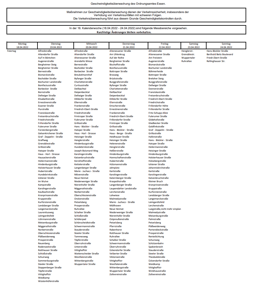 Die Stadt veröffentlicht jede Woche ihre Blitzer-Standorte - trotzdem werden regelmäßig Autofahrer mit zum Teil deutlich zu hohen Geschwindigkeiten erwischt. Damit Euch das nicht passiert, geben wir hier die geplanten Blitzer-Standorte der laufenden Woche (19. bis 24. April) weiter. Allerdings auch mit dem Hinweis, dass anlassbezogen auch an anderen Stellen geblitzt werden kann und auch die Polizei Geschwindigkeitskontrollen durchführt. Wichtig ist auch immer wieder darauf aufmerksam zu machen, dass Stadt, Polizei und auch Radio Essen mit gemeldeten Blitzer-Standorten nicht dafür sorgen wollen, dass Raser gewarnt werden. Laut Polizei bei uns in Essen, mit der wir unseren Umgang mit Blitzer-Meldungen und Verkehrskontrollen immer wieder besprechen, haben Blitzer-Meldungen mit Standort einen überwiegend positiven Effekt. Die Autofahrer würden an den entsprechenden Stellen langsamer fahren, auch wenn die Kontrolle vorbei oder noch nicht gestartet sei. Deshalb veröffentliche man sogar selbst Blitzer-Standorte.