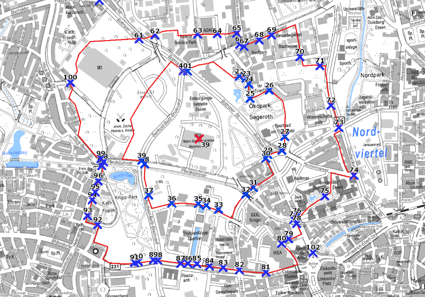 15:09 Uhr: Die betroffenen Busse werden während der Entschräfung folgende Haltestellen nicht anfahren können: Für die Linie 196: Gewerbepark M1, M1 Tenderweg, M1 Gießereiweg, Bamler Servicepark, Zangenstr., Bamlerstraße und die Haltestelle Ellernplatz. Für die Linien 166 und den SB 16: Berliner Platz, Universität Essen, Sportbad Thurmfeld, Gewerbepark M1.