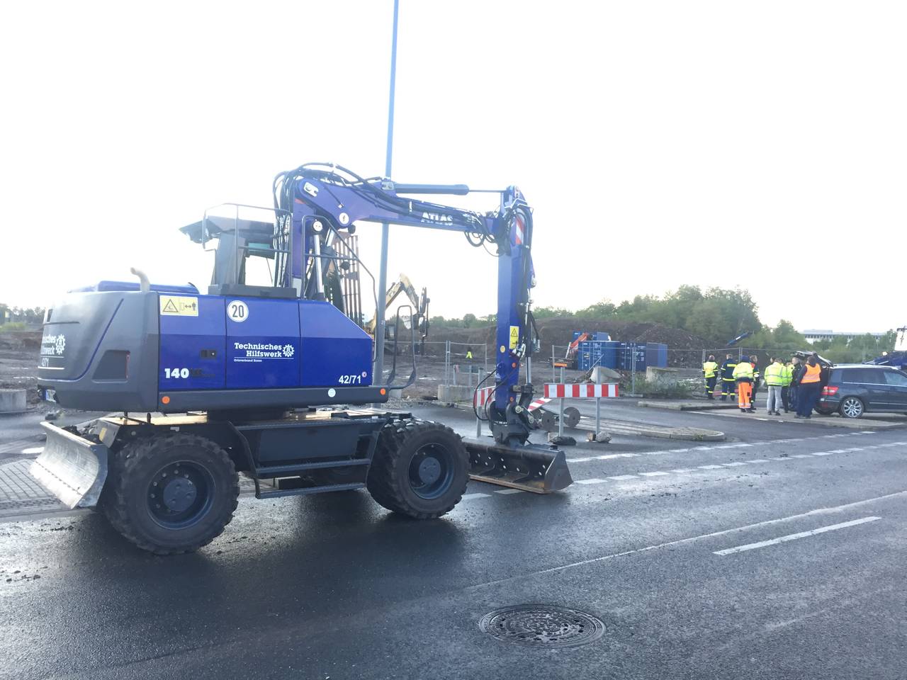 19:33 Uhr: Das Technische Hilfswerk wird dazu gerufen, um dabei zu helfen, den Sand zum Blindgänger zu bekommen. Sie kommen mit mehreren Radladern.
