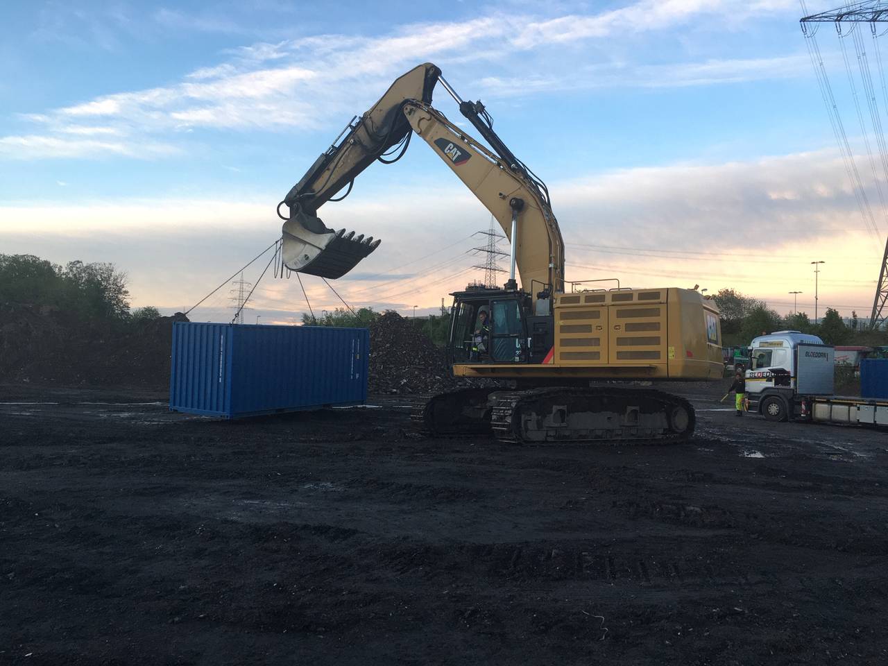 22:06 Uhr: Wenn die Container stehen und der Boden soweit gesichert ist, wird die Bombe in das 8 Meter tiefe Loch gehoben. Danach können die Radlader anfangen, den Sand aus den LKW zum Blindgänger zu bringen.