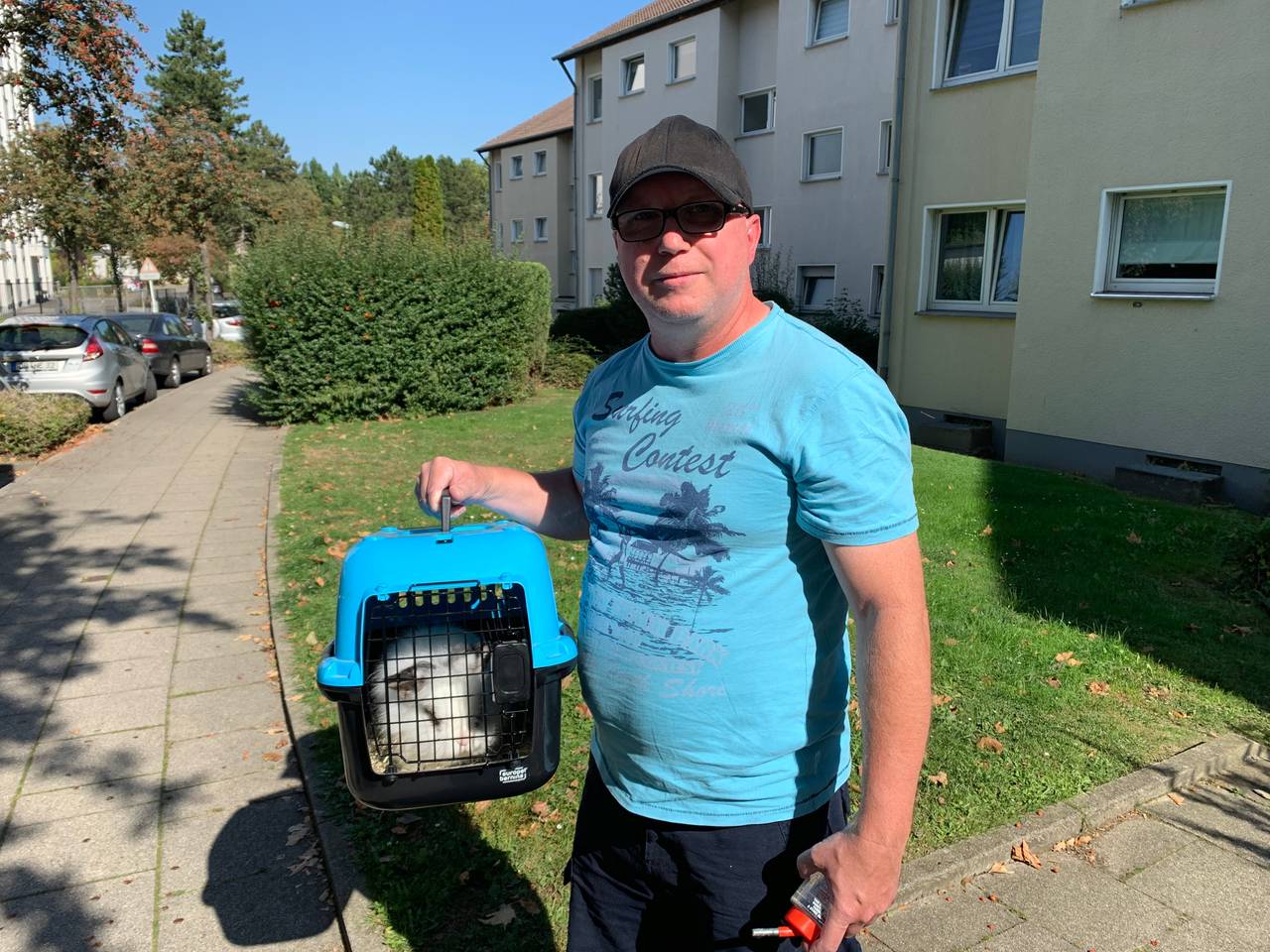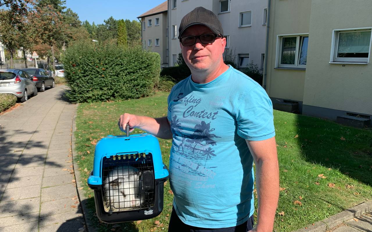 13:40 Uhr: Ralf aus Stoppenberg rettet das Zwergkaninchen seiner Tochter "Prinz" aus der Wohnung, damit es während der Bombenentschärfung bei der Oma in Kray verwöhnt werden kann.