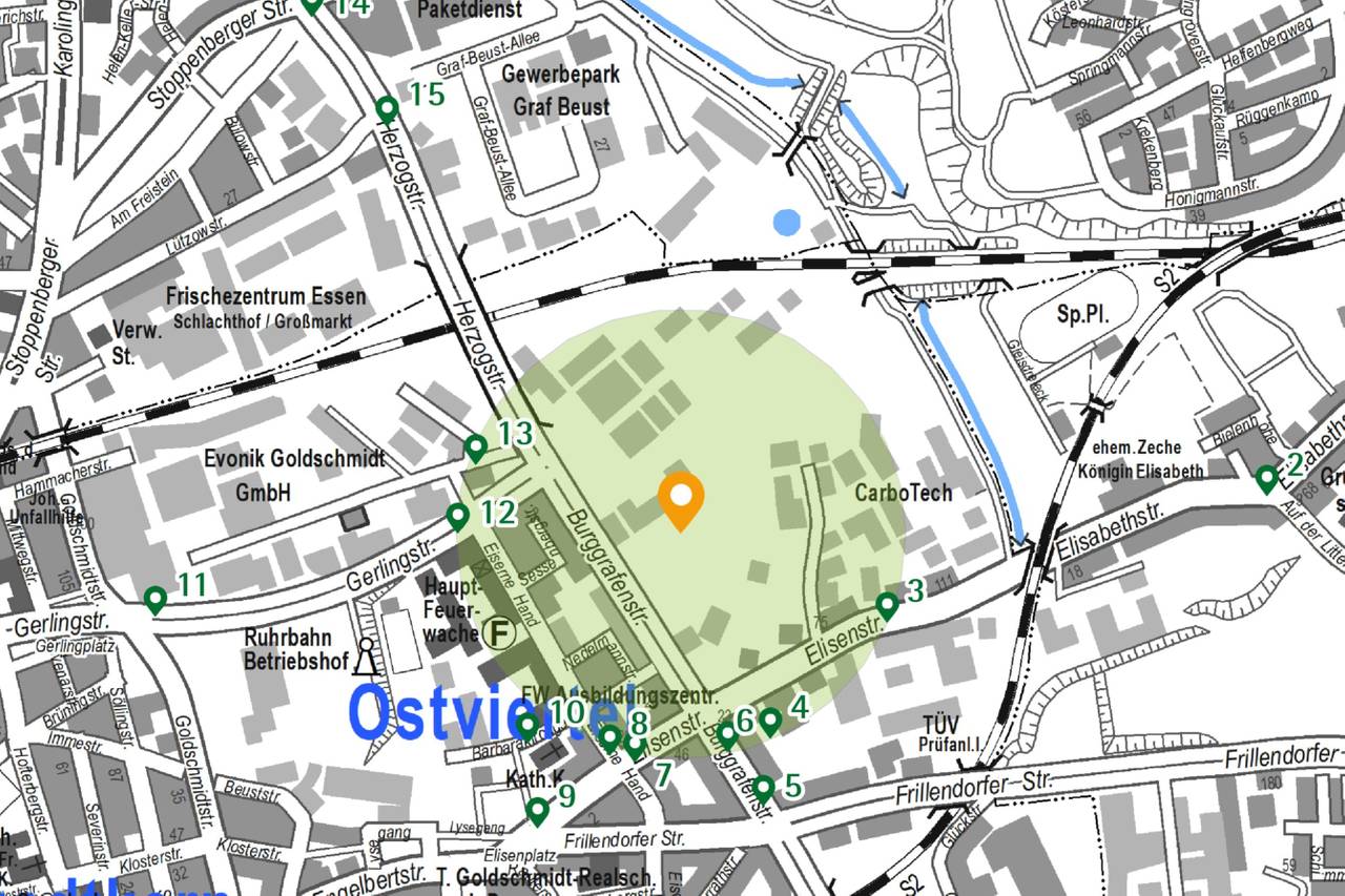 12.47 Uhr: Die Evakuierungskarte ist da. Seit diesem Jahr gibt es nur noch einen Evakuierungskreis von 300 Metern (Hier findet Ihr nochmal die neuen Regeln zu Blindgängerentschärfungen in Essen). Darin ist eigentlich auch ein Teil des Geländes der Feuerwache an der Eisernen Hand. Die ist in Absprache mit dem Entschärfer von der Evakuierung ausgenommen, wird aber eigene Sicherungsmaßnahmen ergreifen, heißt es von der Stadt.