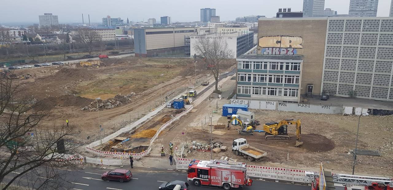 17:39 Uhr: Auf dem Gelände soll ein neues Quartier, das sogenannte Literatur-Quartier entstehen. Es sollen Wohnungen, Geschäfte und Büros gebaut werden. Derzeit werden da die Versorgungskabel und Kanäle verlegt. Das ist relativ kompliziert hat der Bauträger gegenüber Radio Essen erklärt. Dort liegen nämlich sehr viele alte Kanäle und Kabel. Die müssen alle verlegt werden, damit dann später die Anschlüsse für die neuen Gebäude passen.