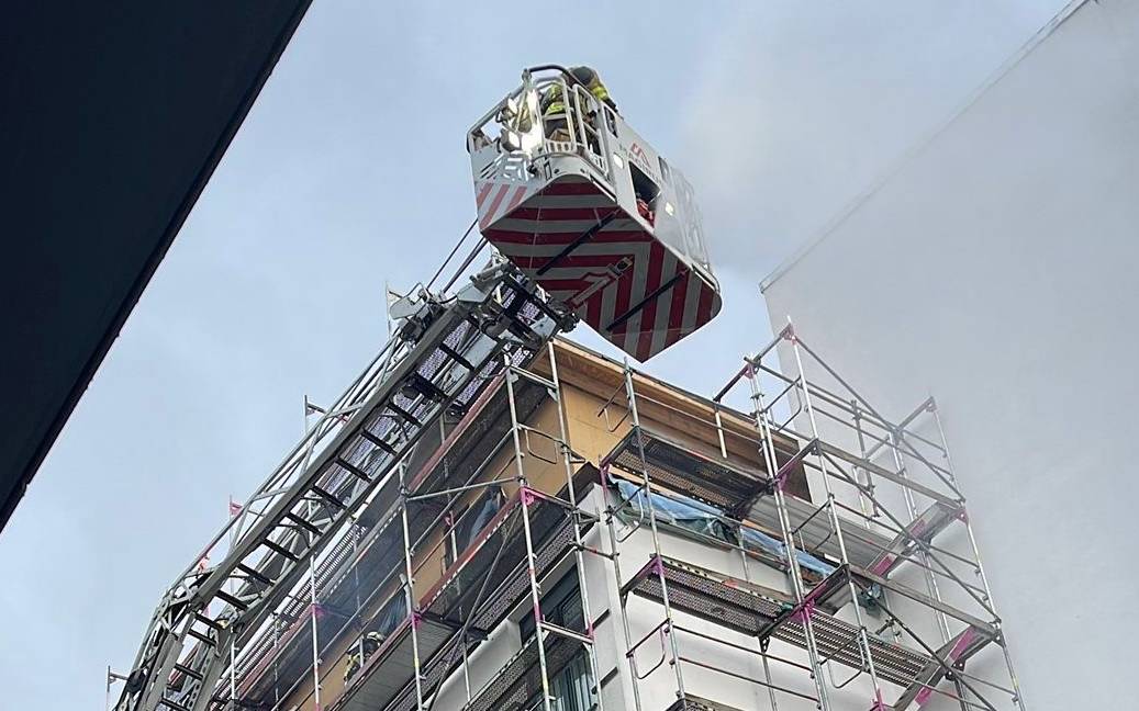 In Essen musste die Feuerwehr brennende Fassadenteile aus einem Gebäude herausschneiden. Dabei wurde ein Auto von einem Fassadenteil getroffen.