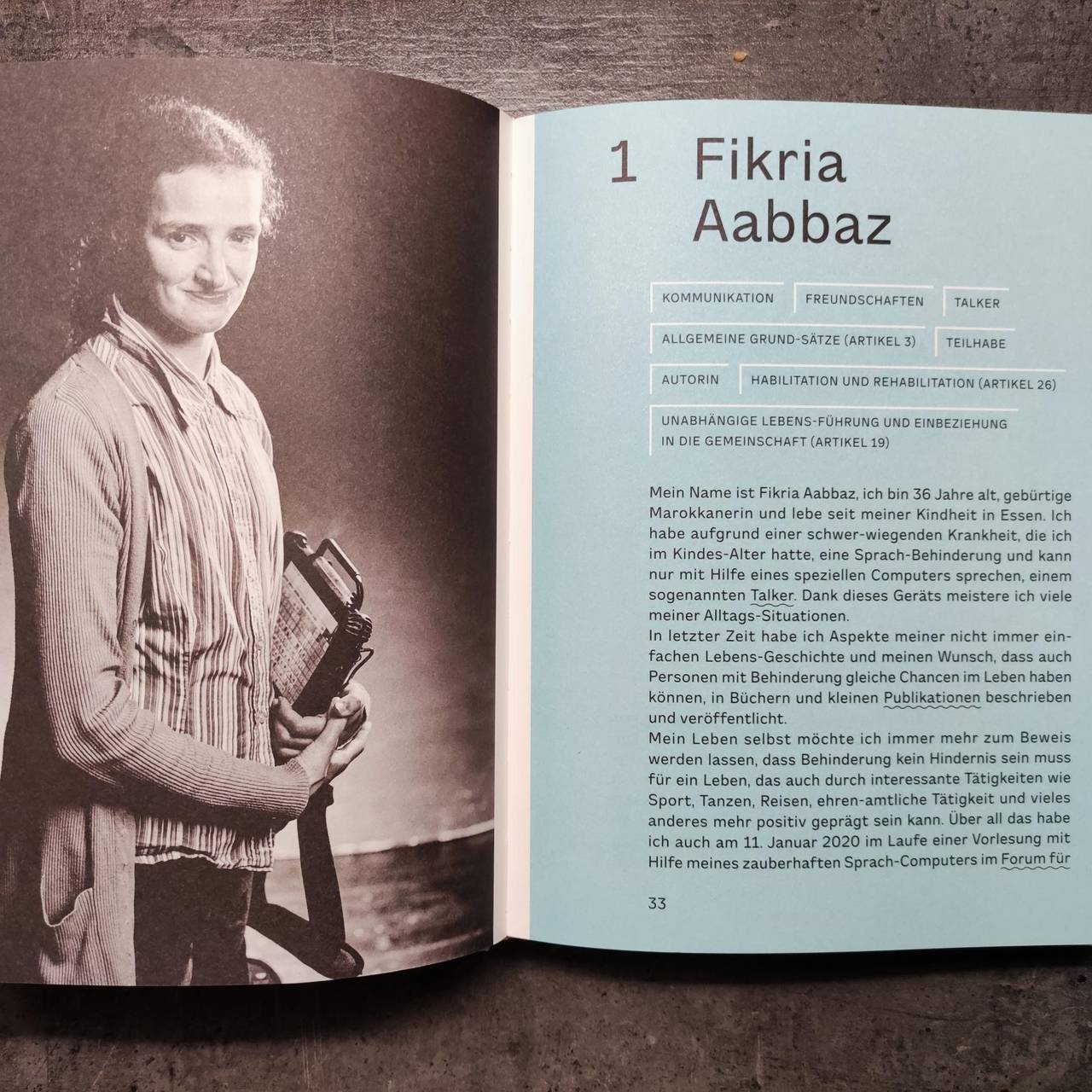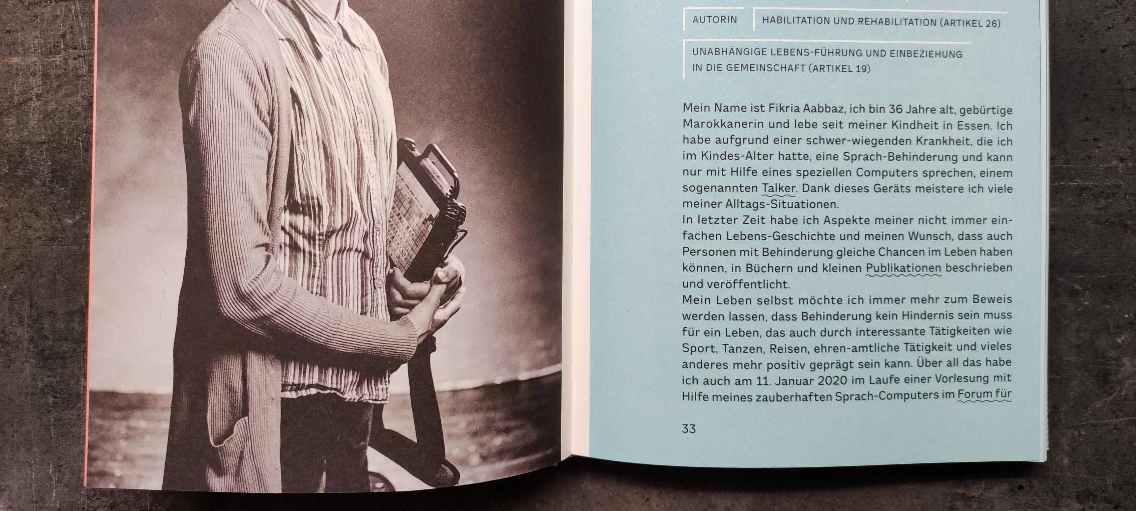 Eine der Protagonistinnen aus dem Buch "Bin auch 'n Mensch" ist Fikria Aabbaz. Sie hat seit einer Erkrankung in der Kindheit eine Sprachbehinderung und kann nur mit Hilfe eines Sprachcomputers sprechen. Im Himmel und Essen-Interview erzählt sie, warum sie bei dem Projekt mitgemacht hat, was sie sich davon erhofft und wo sie gerne arbeiten würde, wenn sie dürfte (Im Kindergarten oder in der Schule, am liebsten etwas mit Kindern).
