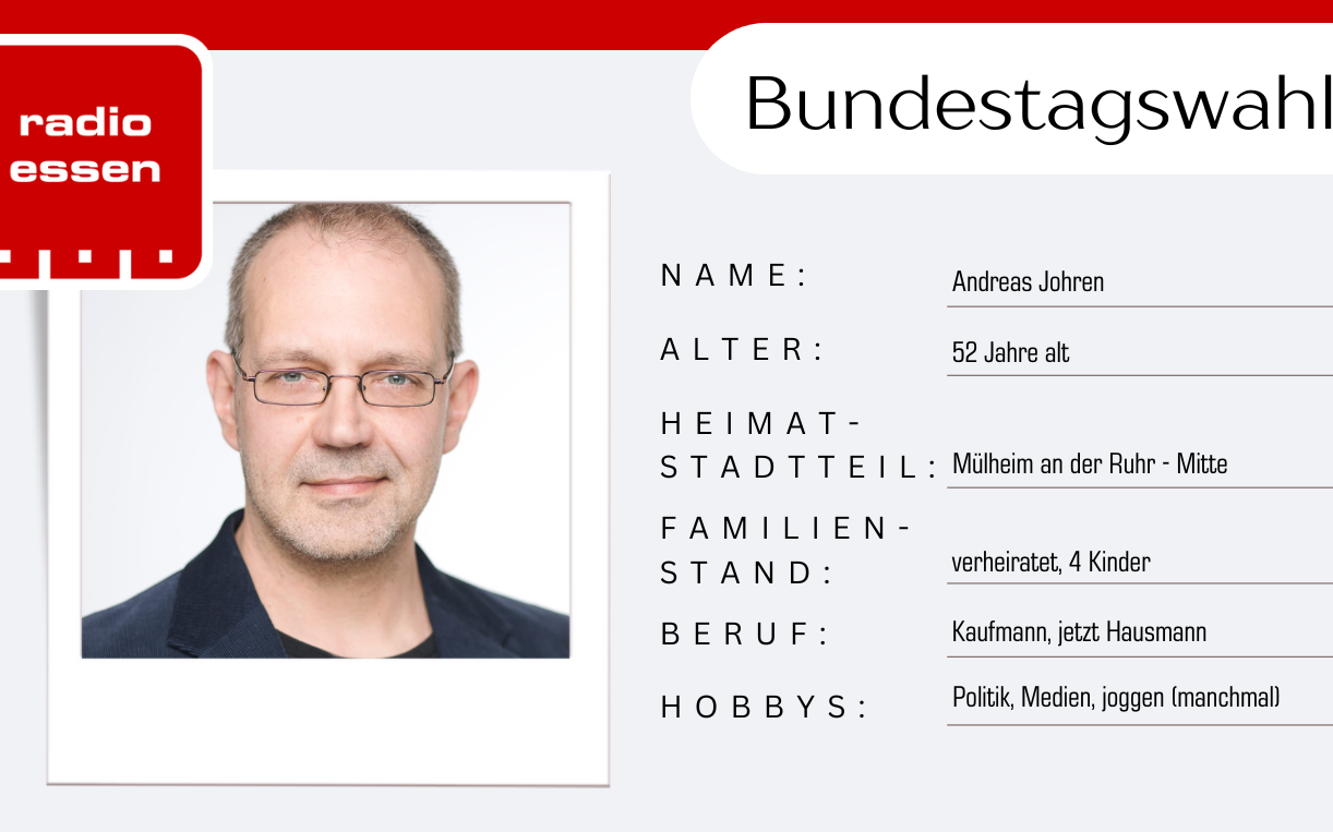 Andreas Johren geht für die Partei Die Linke im gemeinsamen Wahlkreis mit Mülheim ins Rennen. Der 52-jährige gebürtige Mülheimer ist verheiratet und Vater von vier Kindern. Beruflich hat er sich zuerst im kaufmännischen Bereich bewegt, inzwischen widmet er sich voll und ganz seiner Familie als Vater und Hausmann. In seiner Freizeit interessiert er sich für Politik, Medien – und ab und zu schnürt er die Laufschuhe fürs Joggen.