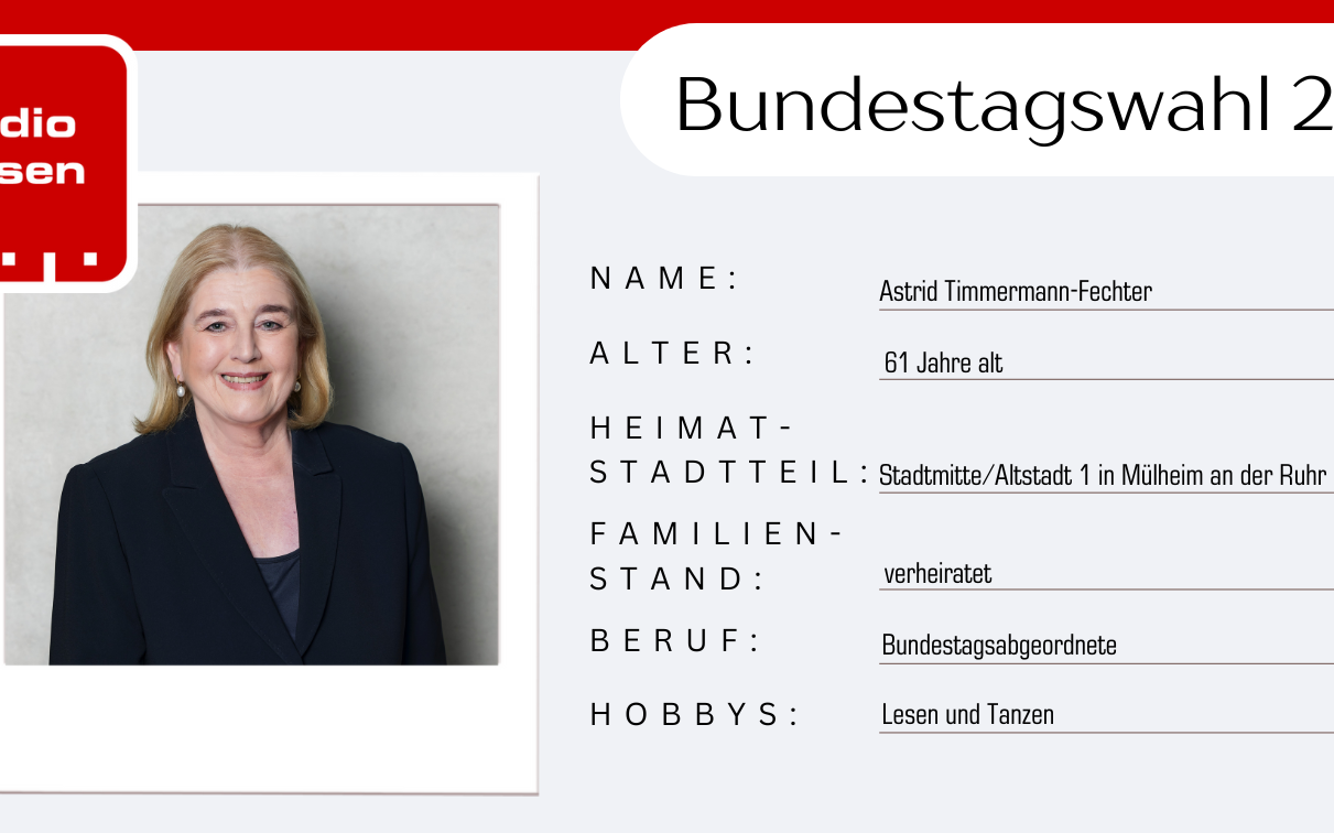 Astrid Timmermann-Fechter ist 61 Jahre alt, Mitglied der Christlich Demokratischen Union Deutschlands (CDU) und stammt ursprünglich aus der Stadtmitte/Altstadt 1 in Mülheim an der Ruhr. Sie ist verheiratet, Bundestagsabgeordnete und ihre Hobbys sind Lesen und Tanzen. Das sind ihre persönlichen Antworten auf unsere fünf Radio Essen-Fragen: