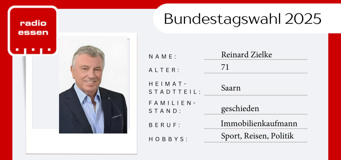Reinard Zielke tritt für die Alternative für Deutschland (AfD) als Direktkandidat an. Er ist 71 Jahre alt, stammt gebürtig aus Mülheim-Saarn und ist geschieden. Beruflich ist er Immobilienkaufmann. Zu seinen Hobbys zählen Sport, Reisen und Politik.