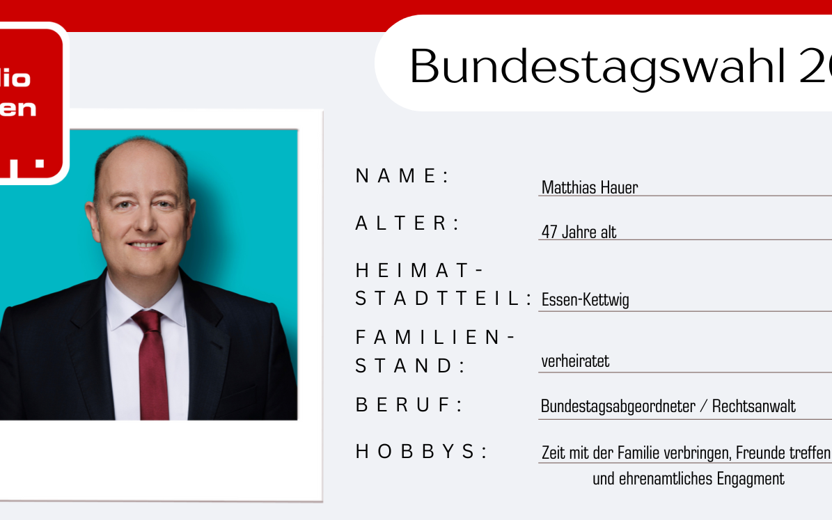Matthias Hauer ist 47 Jahre alt, Mitglied der Christlich-Demokratischen Union (CDU) und stammt aus Kettwig. Er ist verheiratet und beruflich als Bundestagsabgeordneter sowie Rechtsanwalt tätig. In seiner Freizeit verbringt er gerne Zeit mit seiner Familie, trifft Freunde und engagiert sich ehrenamtlich.