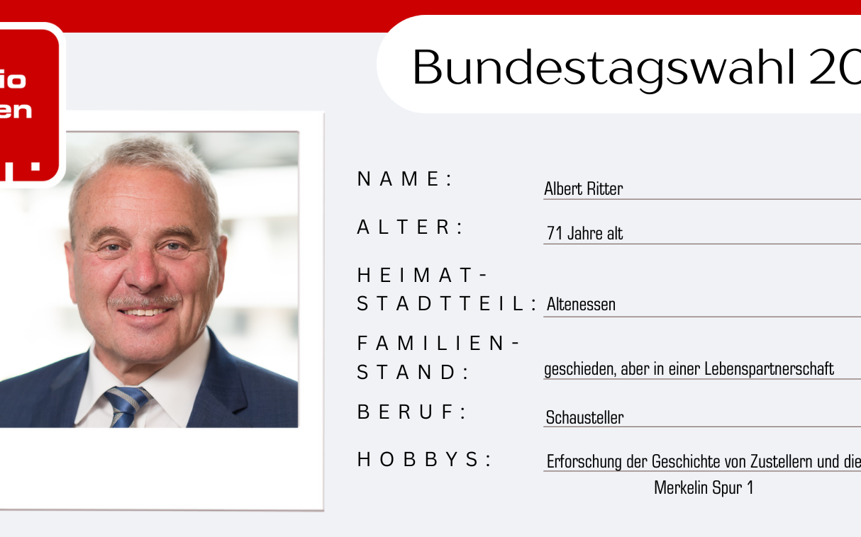 Albert Ritter, 71 Jahre alt, kommt aus Altenessen und ist Mitglied der Sozialdemokratischen Partei Deutschlands (SPD). Er ist geschieden, befindet sich jedoch in einer neuen Partnerschaft. Beruflich ist er als Schausteller tätig und interessiert sich auch für die Erforschung der Geschichte von Schaustellern. Auch die Märklin Spur 1 hat schon seit Jahren sein Interesse geweckt. Das sind seine Antworten auf unsere fünf Radio Essen-Fragen: