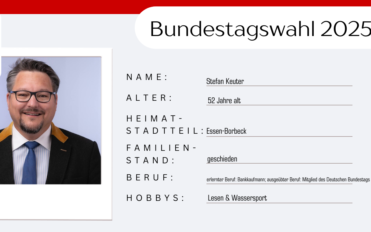 Stefan Keuter, 52 Jahre alt, ist ein Politiker der Alternative für Deutschland (AfD). Geboren in Essen-Borbeck und aufgewachsen in Burgaltendorf, lebt er heute in Essen-Werden. Als Bankkaufmann ausgebildet, hat er sich im Laufe seiner Karriere der Politik zugewandt und ist heute Mitglied des Deutschen Bundestags. In seiner Freizeit liest er gerne und genießt Wassersport.