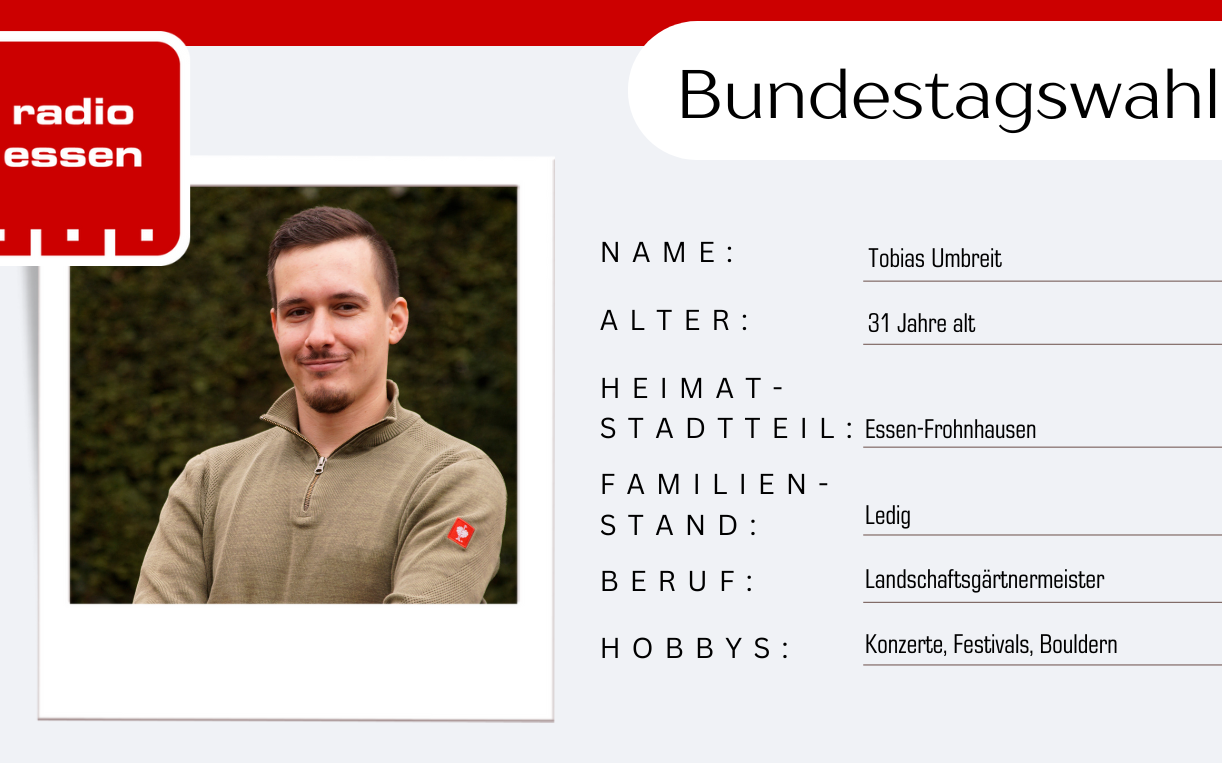Die Linke schickt Tobias Umbreit im Wahlbezirk III ins Rennen. Der 31-Jährige kommt aus Frohnhausen, ist ledig und arbeitet als Landschaftsgärtnermeister. In seiner Freizeit ist er oft auf Festivals und Konzerten unterwegs und liebt es, zu bouldern. Das sind seine Antworten auf unsere Radio Essen-Fragen: