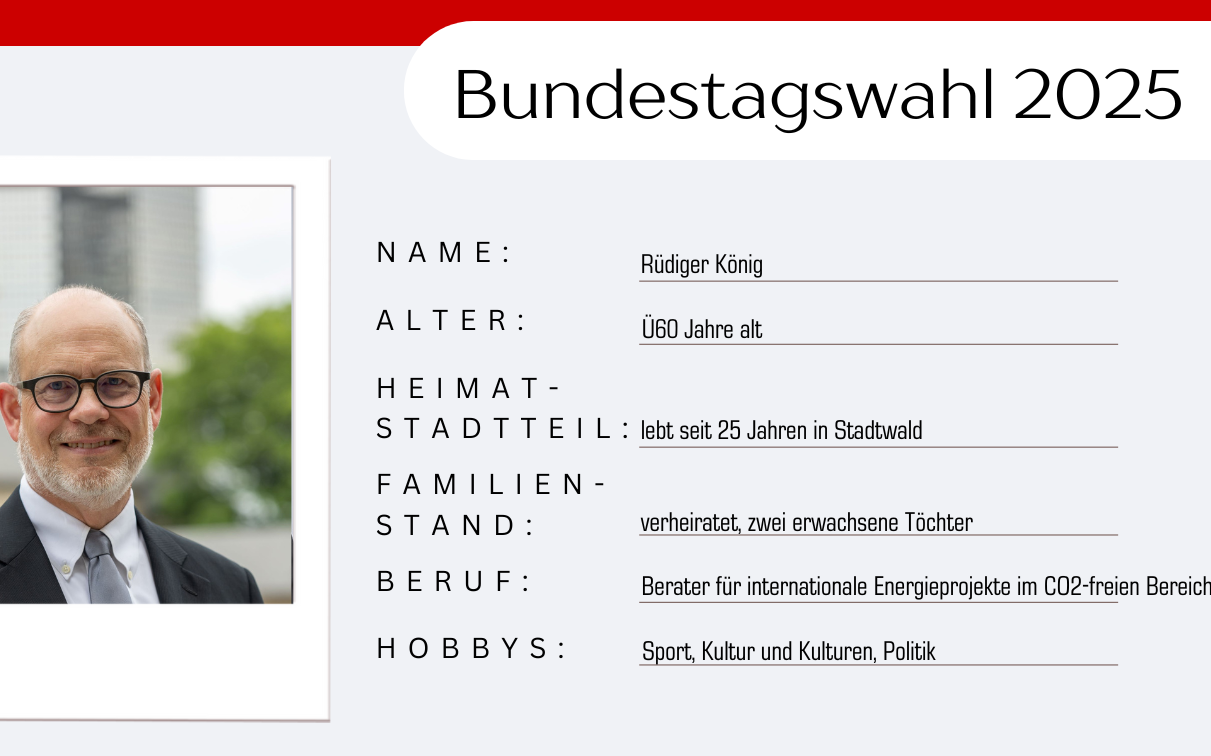 Rüdiger König ist Mitglied der Freien Demokratischen Partei (FDP), über 60 Jahre alt und lebt seit 25 Jahren Essen-Stadtwald. Er ist verheiratet, hat zwei erwachsene Töchter und arbeitet als Berater für internationale Energieprojekte im CO2-freien Bereich. In seiner Freizeit interessiert er sich für Sport, Kultur, verschiedene Kulturen und Politik.