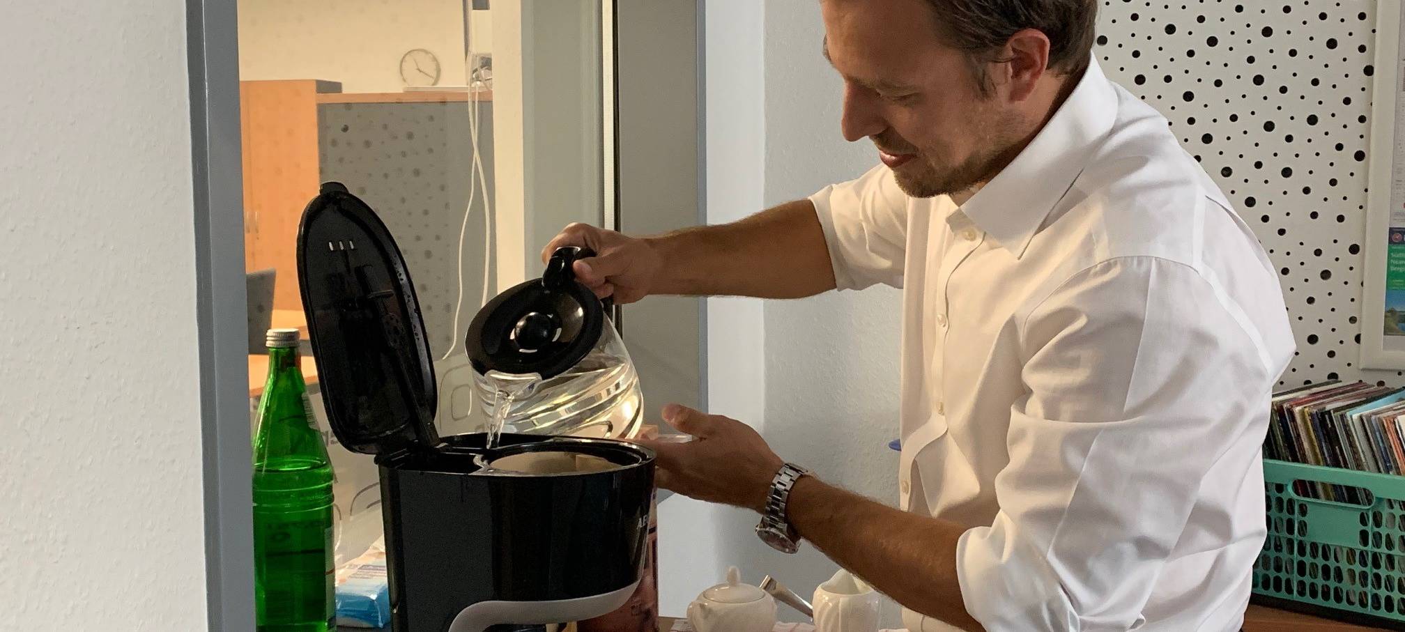 Florian Fuchs kocht Kaffee für Moderatorin Angela Hecker