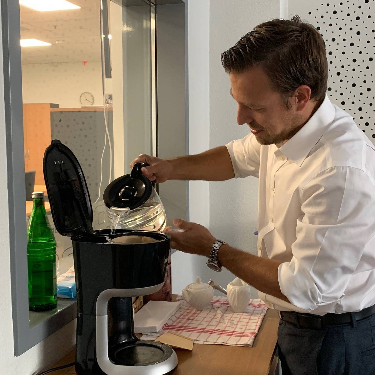 Endlich hat es auch die letzte Bundestagspartei zu uns geschafft: Der erste Politiker-Praktikant der CDU war Florian Fuchs aus dem Wahlkreis Essen II (Norden und Osten). Eine Stunde lang musste auch er für die ganze Redaktion Kaffee kochen, den Wetterbericht sprechen und unter Zeitdruck Fragen beantworten. Am besten hat dem Direktkandidaten das Kaffeekochen gefallen - vor allem, weil der Kaffee so gut bei Frühschicht-Moderatorin Angela Hecker angekommen ist.